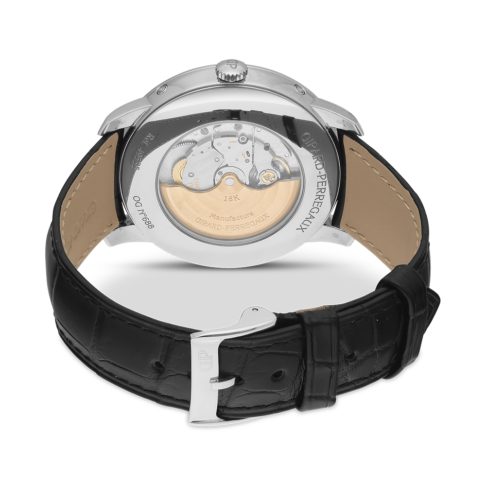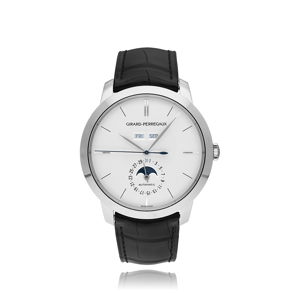 Girard-Perregaux 1966 with a 40 mm white gold case and a sapphire glass, water resistant; inside is the automatic calibre gp03300-0009, a silver index face date & moon indication, the bracelet is a alligator leather; accessory: sales guarantee (original), bucherer box.