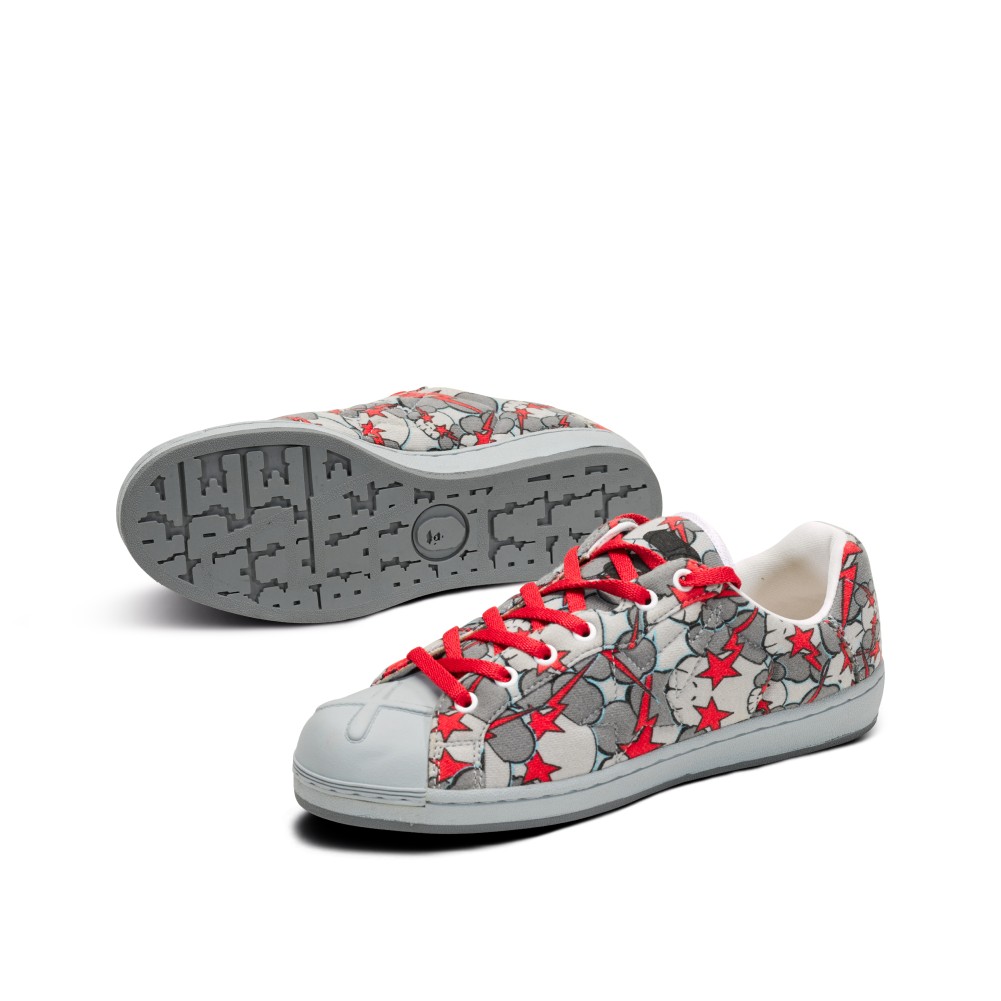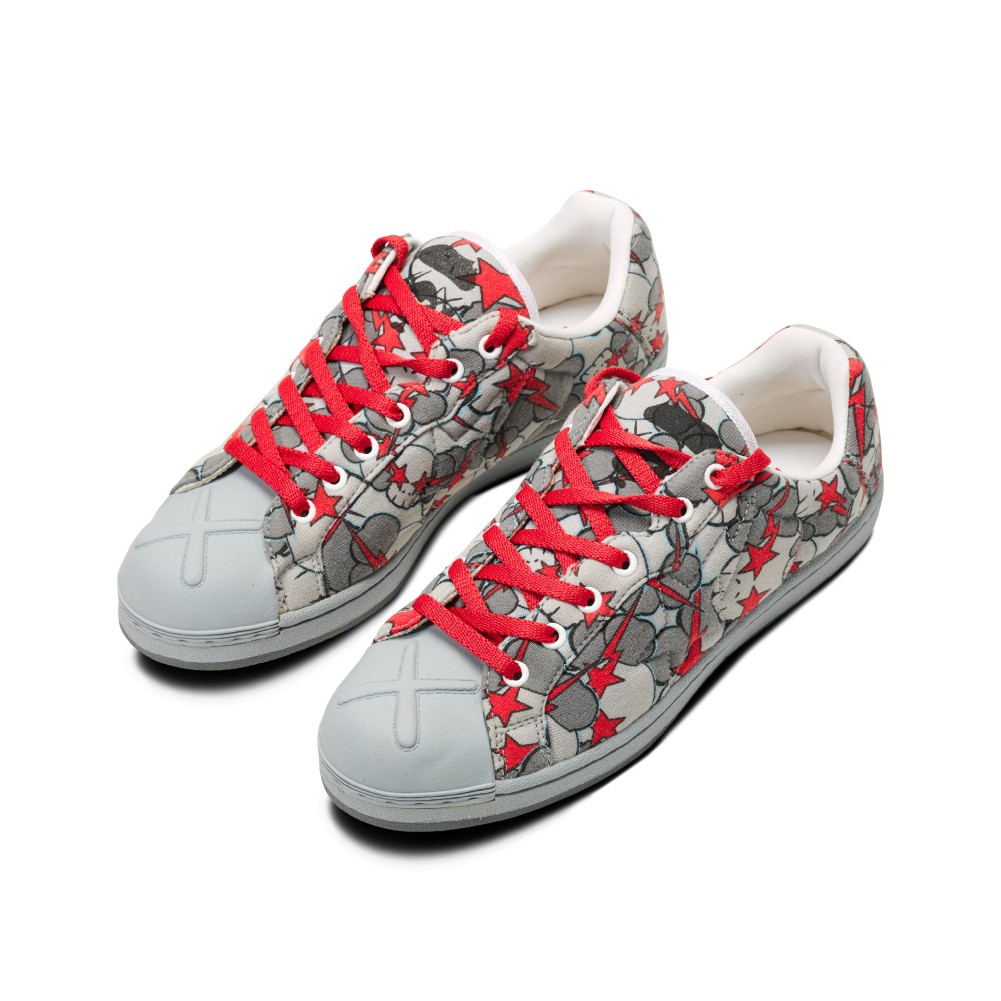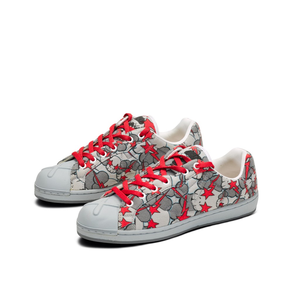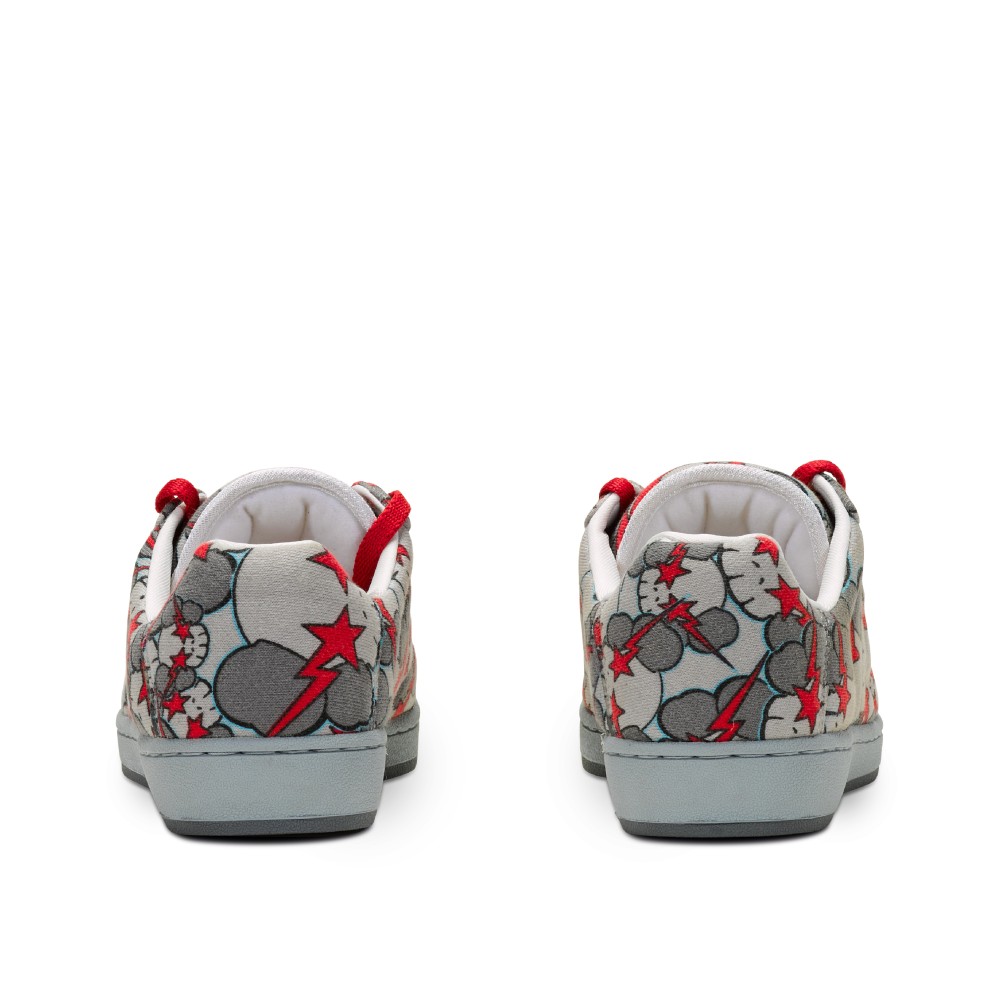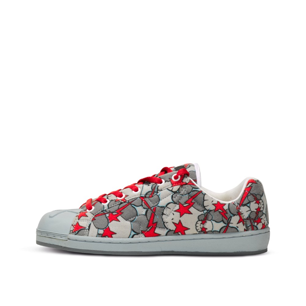 The upper is made of a grey fabric with KAWS? design and figures throughout ? the same design which is found across other Bape products at the time, such as the Bapesta KAWS FS-010 and complementary apparel. The outsoles are a matching grey color, while the only real color comes from the red laces which match the thunderbolt graphics on the print.
