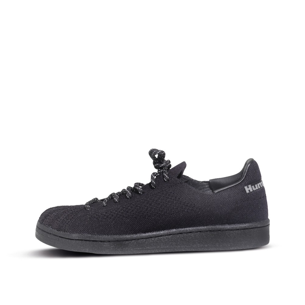- Both have all-black mesh uppers with adidas “Hu” branding.