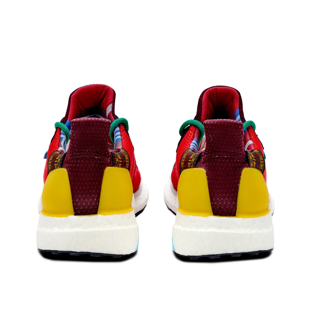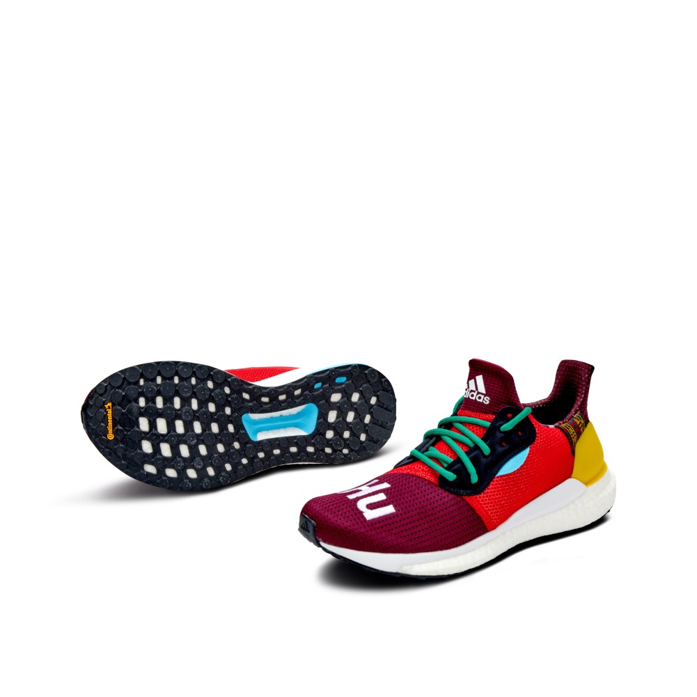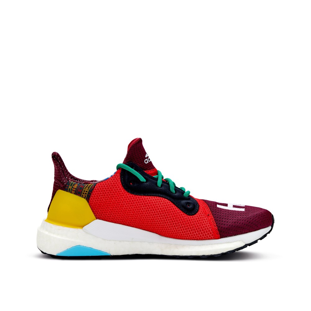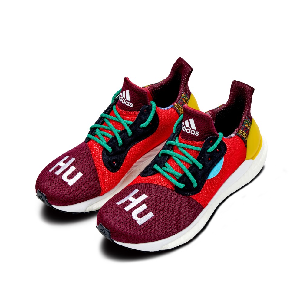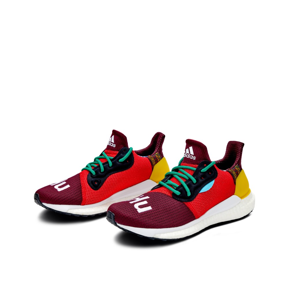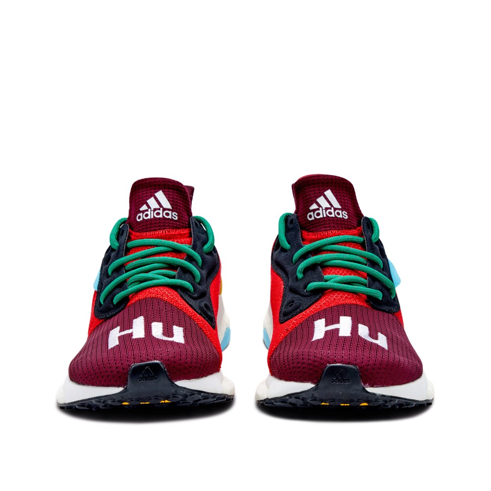 Beginning in 2014, Pharrell Williams and adidas teamed up to produce an evolving line of sneakers. The Pharrell x Solar Hu Glide “Maroon” Friends and Family features a rare colorway, and was released in 2018 exclusively to friends and family of the brand and pop icon. The upper consists of a breathable mesh in maroon and bright red, with yellow accents and green laces. “Hu” text is embroidered on the toe box in white, and the pair sits atop a full-length Boost foam white outsole.