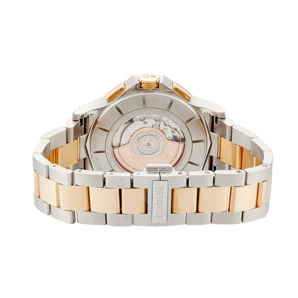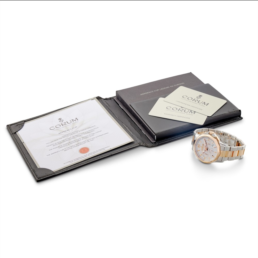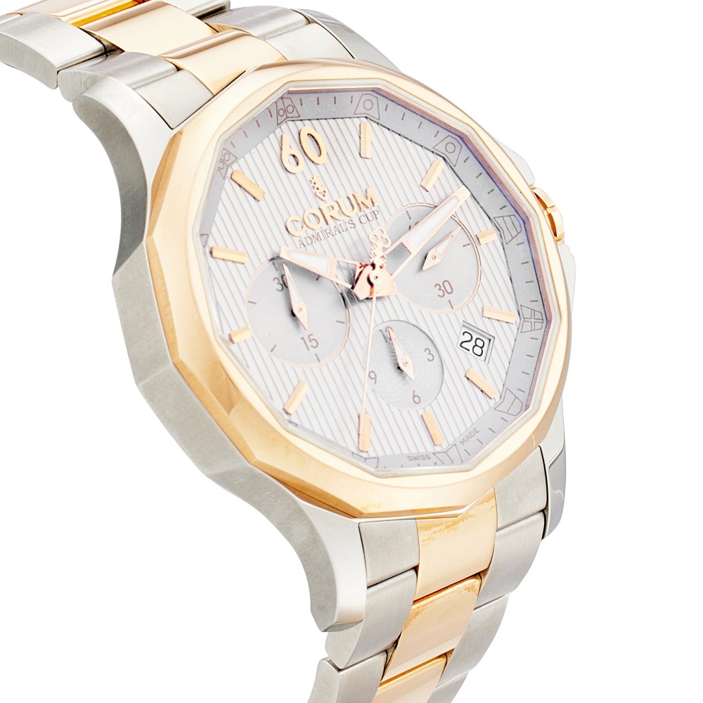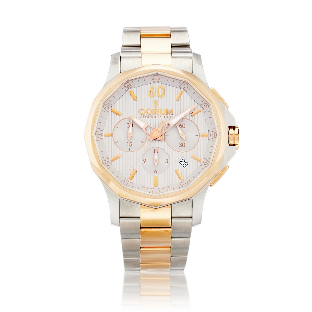 This Admirals Cup reference 984.101.24/V705FH11 is a rose gold and stainless steel automatic wristwatch with chronograph and date, circa 2012, case size of 42mm, crafted in stainless steel with 18k rose gold with a sapphire exhibition case back. It runs on an automatic movement with a power reserve of approximately 42 hours. Water resistance approximately 30 meters. This watch comes with paper only.