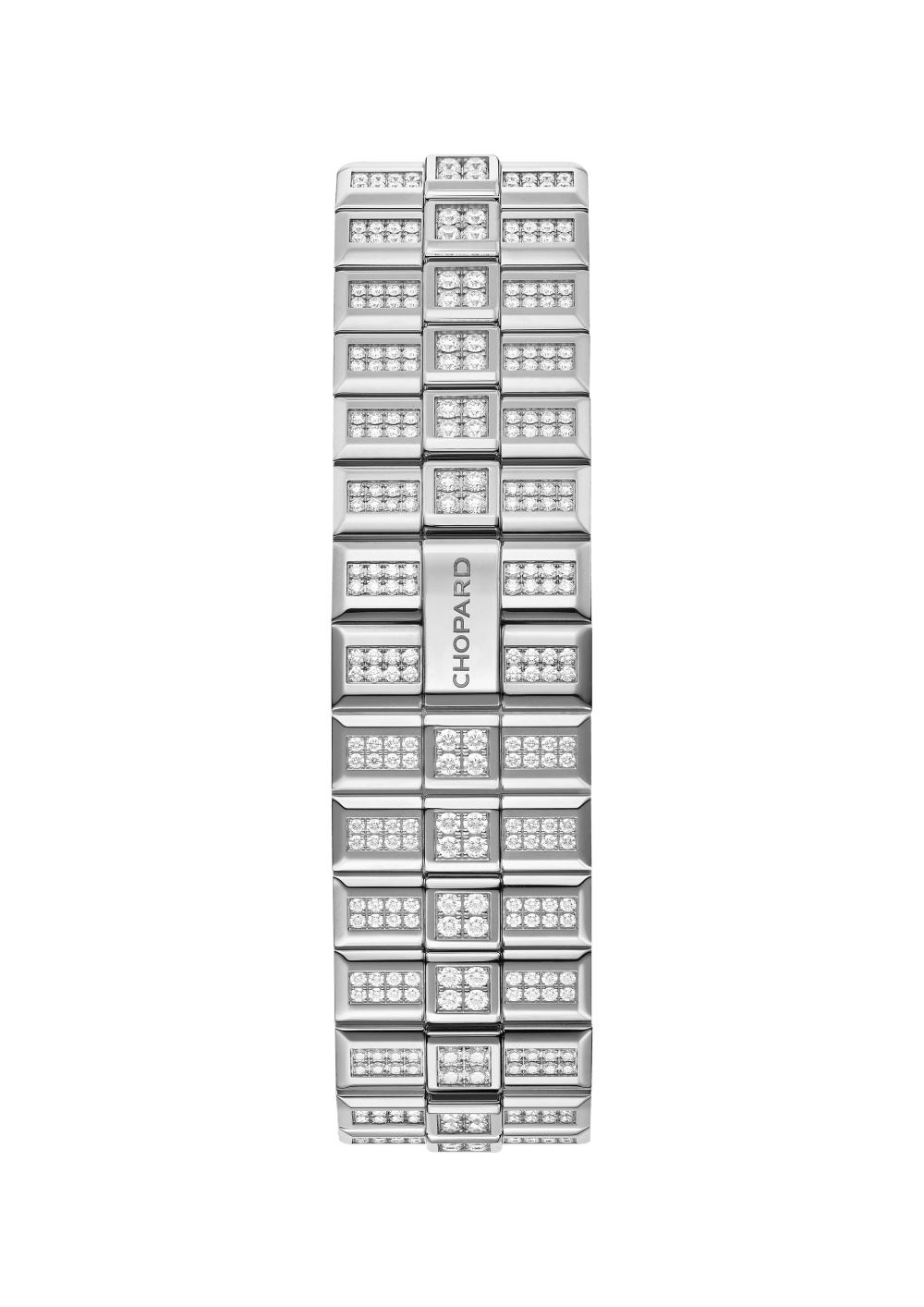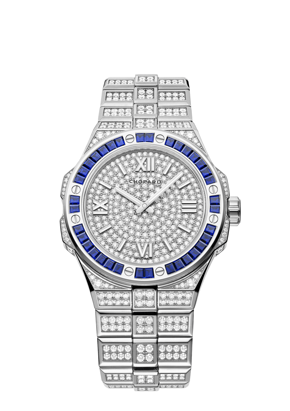 Inspired by the grace of the eagle and the majesty of the Alps, Chopard’s sporty-chic watches welcome the Alpine Eagle Frozen diamond and sapphire watch. Crafted in ethical 18-carat white gold, its 41 mm-diameter case and integrated bracelet are entirely set with diamonds while the bezel is set with trapeze-cut sapphires. Endowed with technical expertise entirely on a par with its impressive esthetics, this jewel-encrusted version of the watch for contemporary eagles is equipped with the Chopard 01.03-C movement with automatic winding and a 60-hour power reserve. Thanks to its abundance of diamonds, reminiscent of tiny snowflakes glistening on Alpine peaks, this diamond watch shines with an ethical, responsible aura.