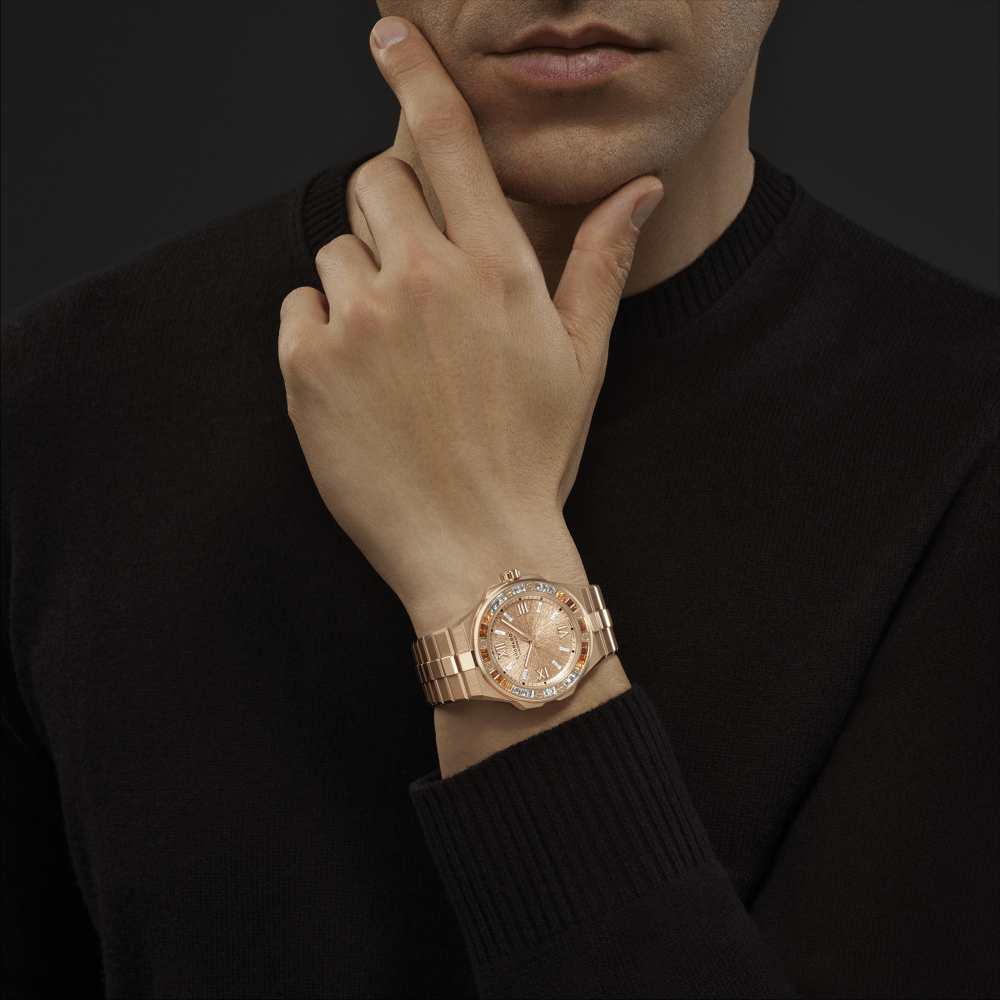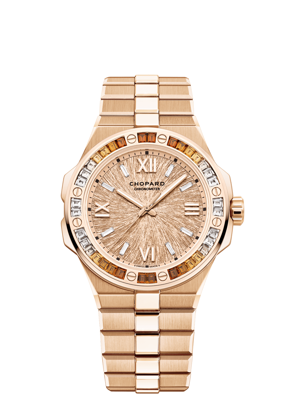 The Alpine Eagle collection welcomes a new series of 41 mm-diameter models adorned with dials in luminous shades and bezels set with a gemstone gradient. Crafted in 18-carat ethical rose gold, its bezel is set with trapeze-cut spessartite garnets and white sapphires. As technically advanced as it is aesthetically pleasing, this model is equipped with Chopard’s 01.15-C automatic movement and a 60-hour power reserve.