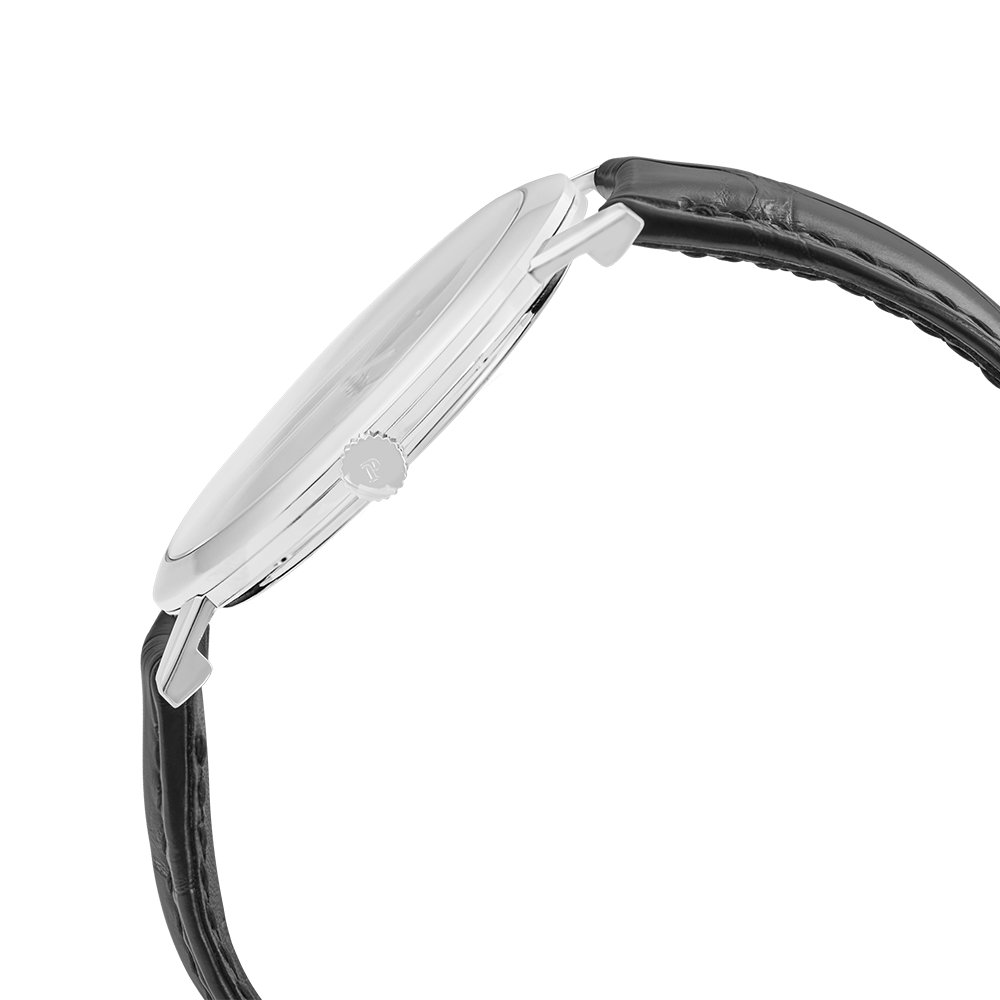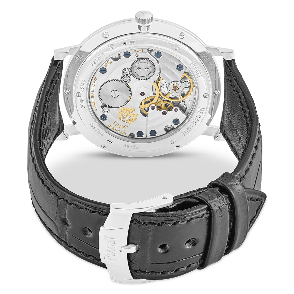 Piaget Altiplano with a 40 mm white gold case and a sapphire glass, water resistant; inside is the manual calibre 838p, a black index face without date indication, the bracelet is a alligator leather; accessory: bucherer box.