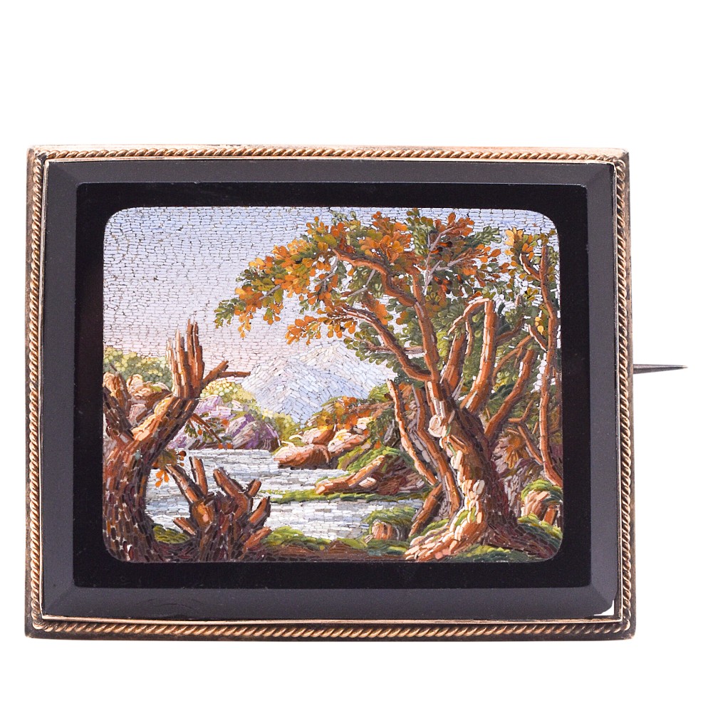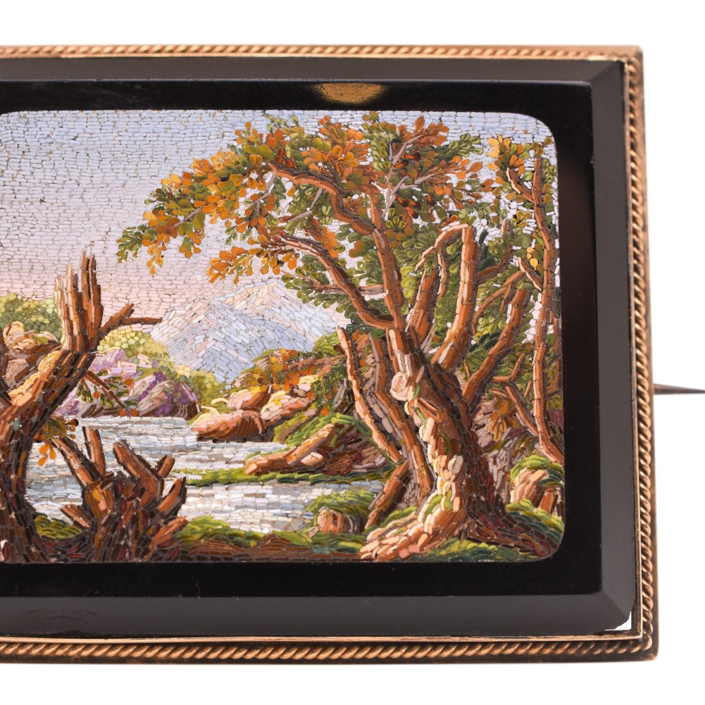Italian micromosaic depicting a landscape on a rectangular glass plaque.