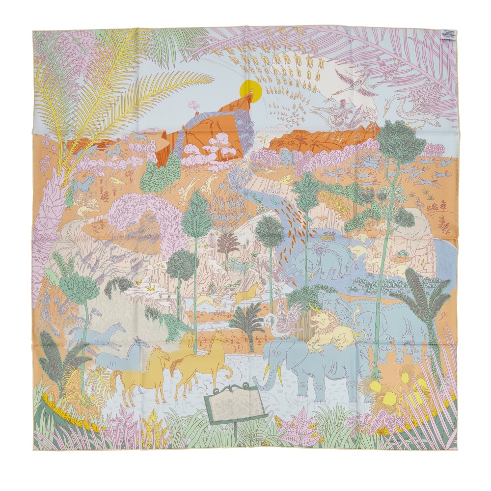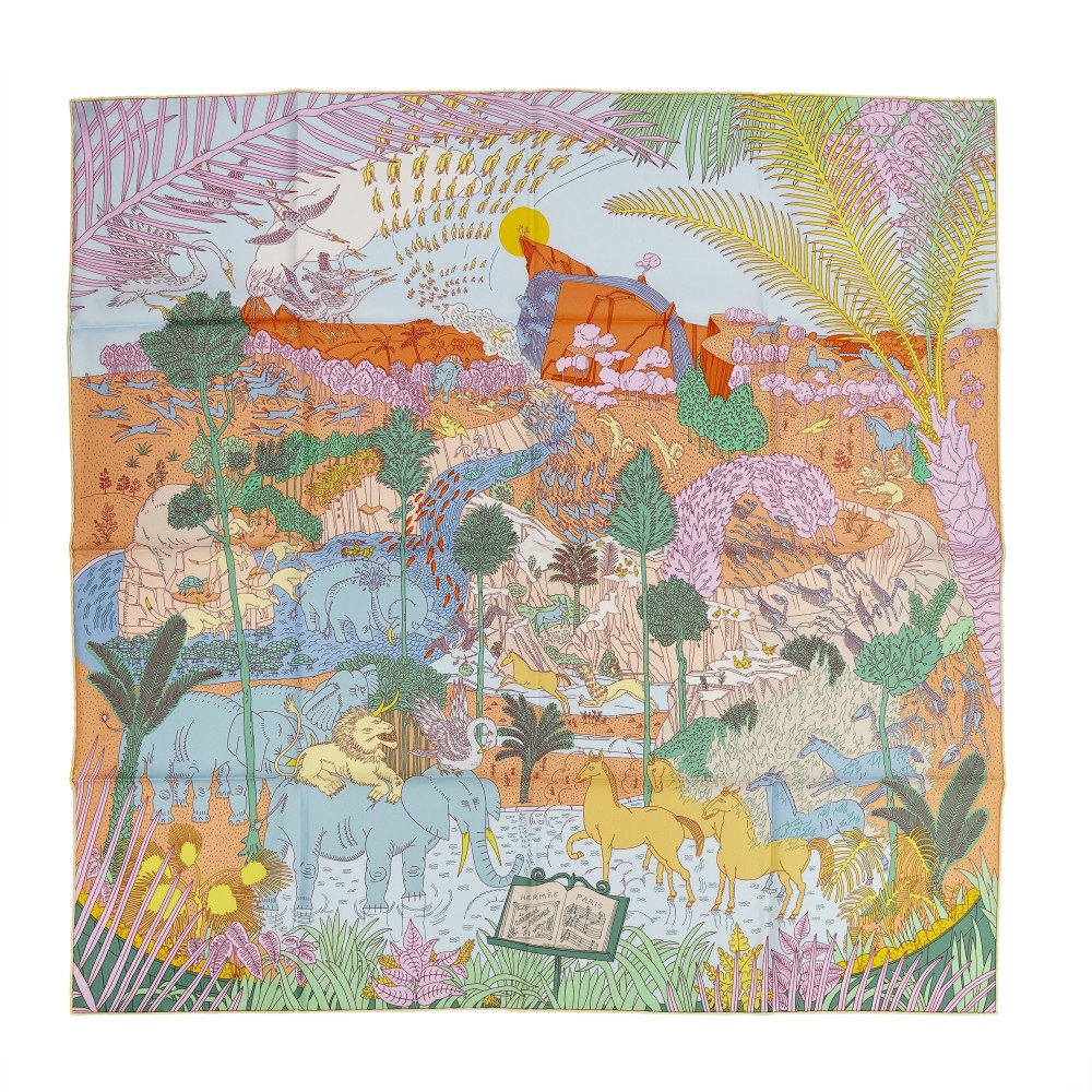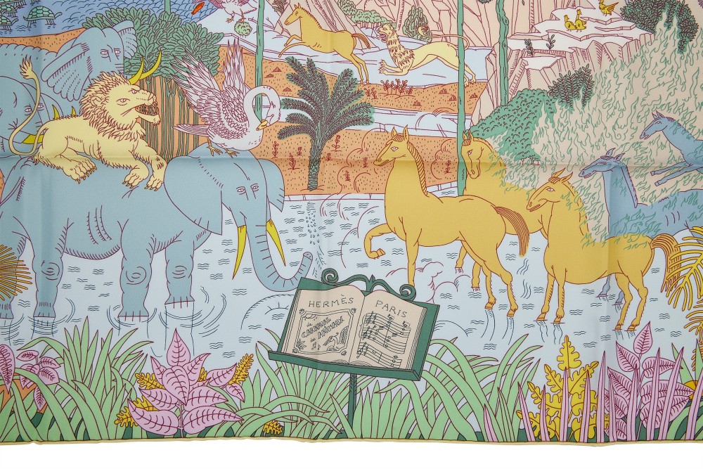 Herm?s Aqua, Vert and Jaune Silk Le Carnaval des Animaux Scarf 90