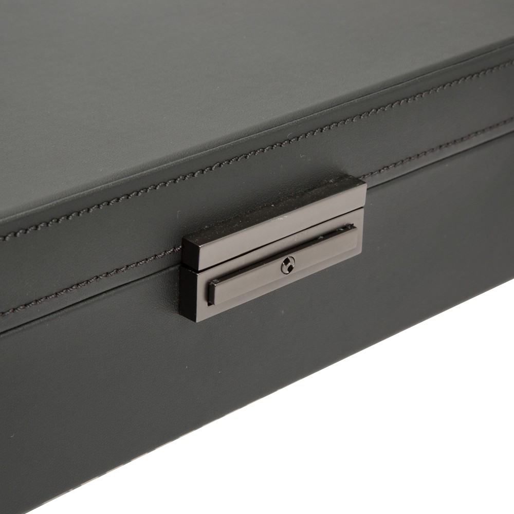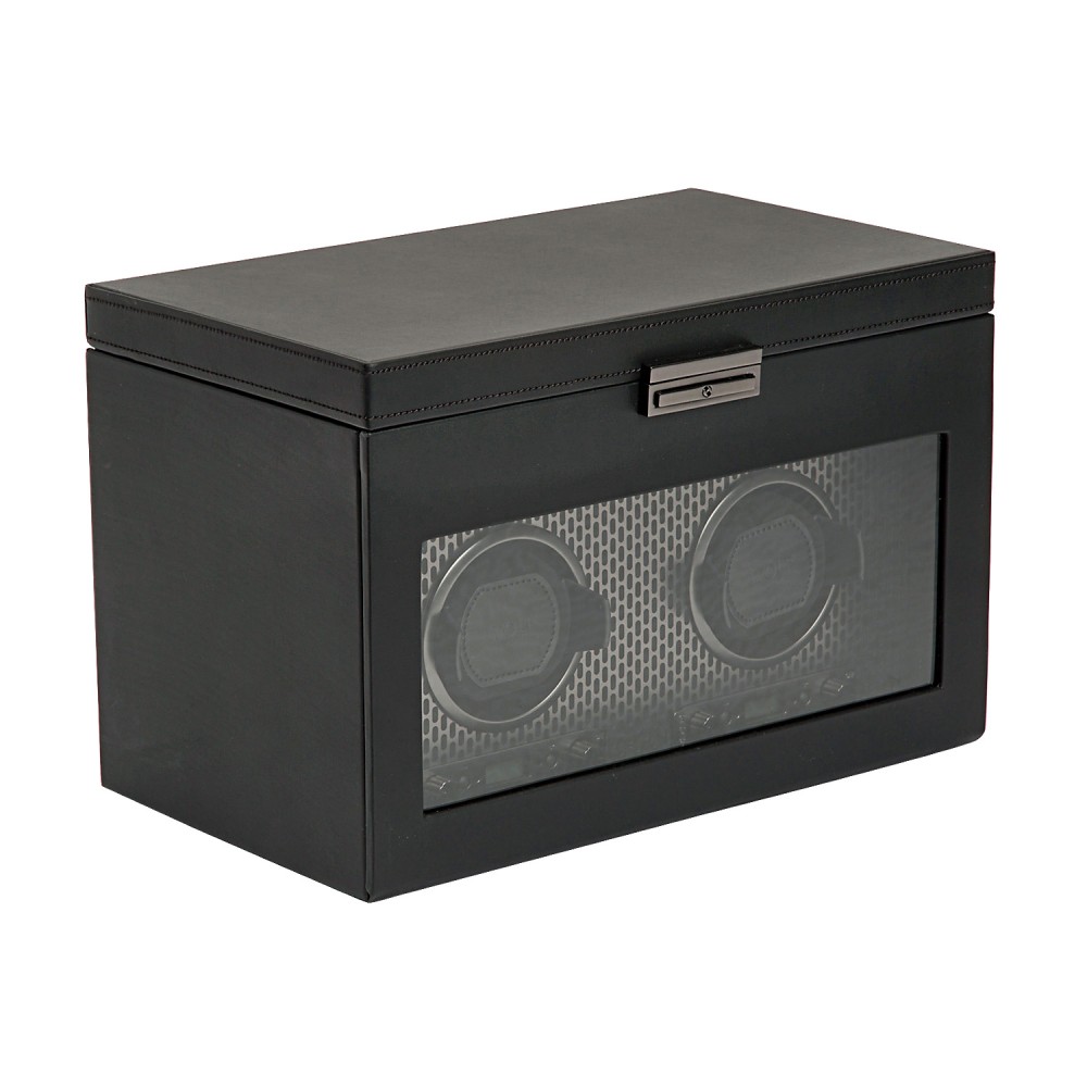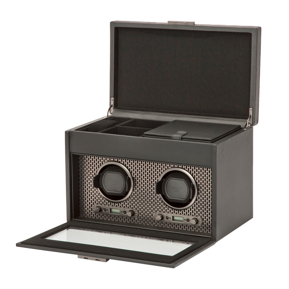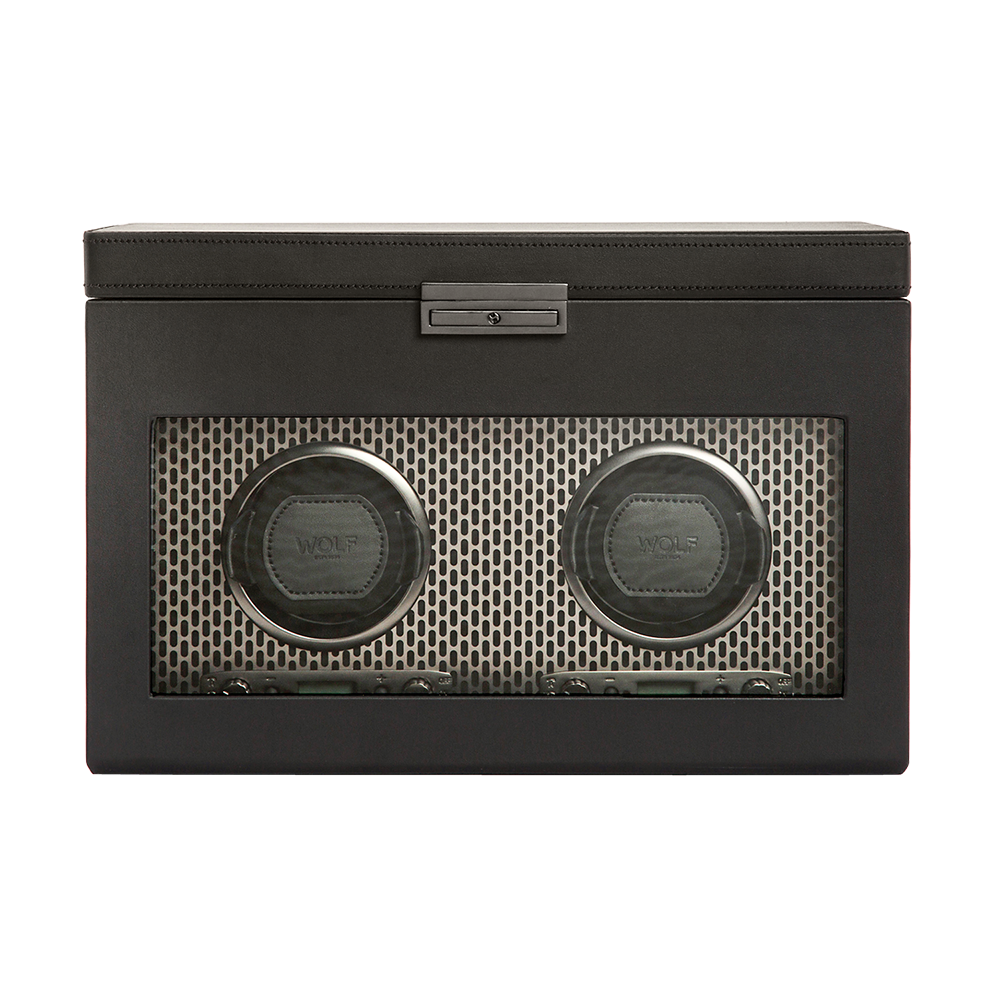 Powder-coated and copper-plated laser-cut perforated steel melded with clean, sleek lines. AXIS drives a modern, bold look for safekeeping your timepieces. Our patented technology of counting rotations of the axis of your watch guarantees precise turns per day. Bold luxury, faultless design, take AXIS for a spin in the double watch winder with storage.