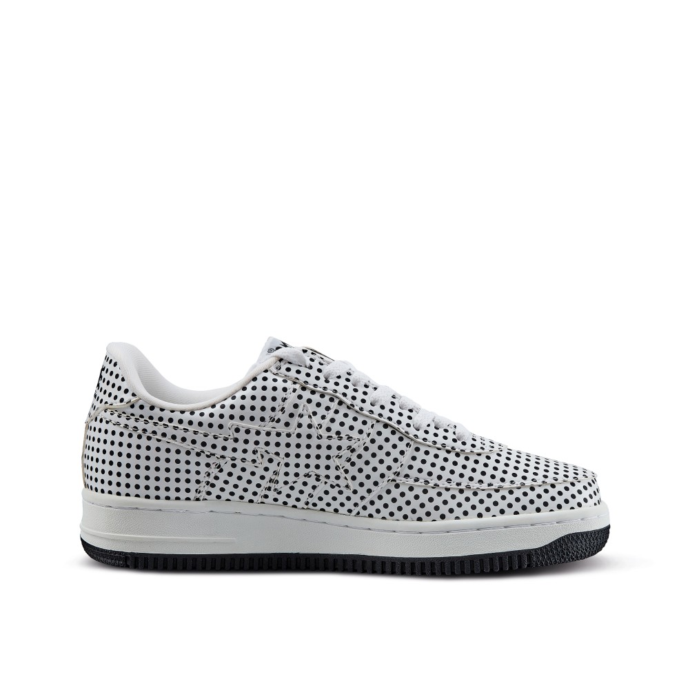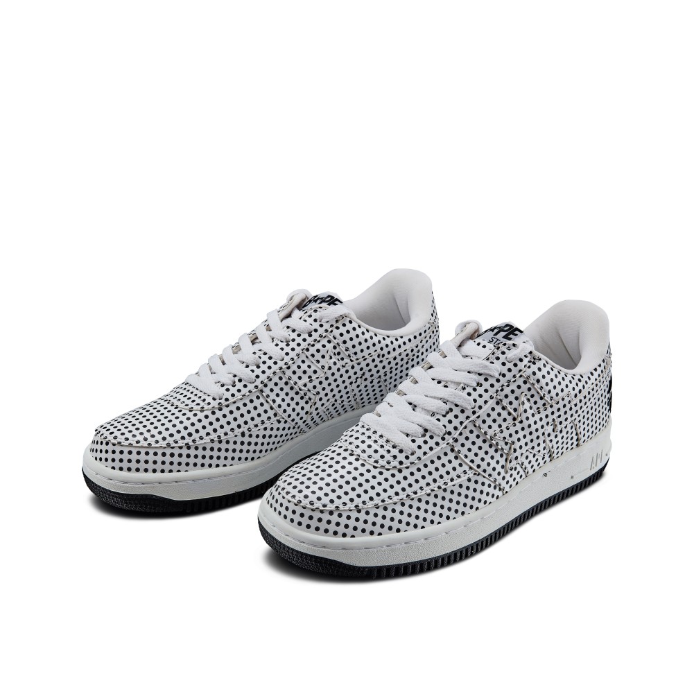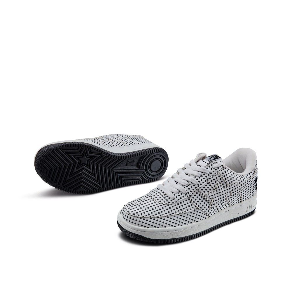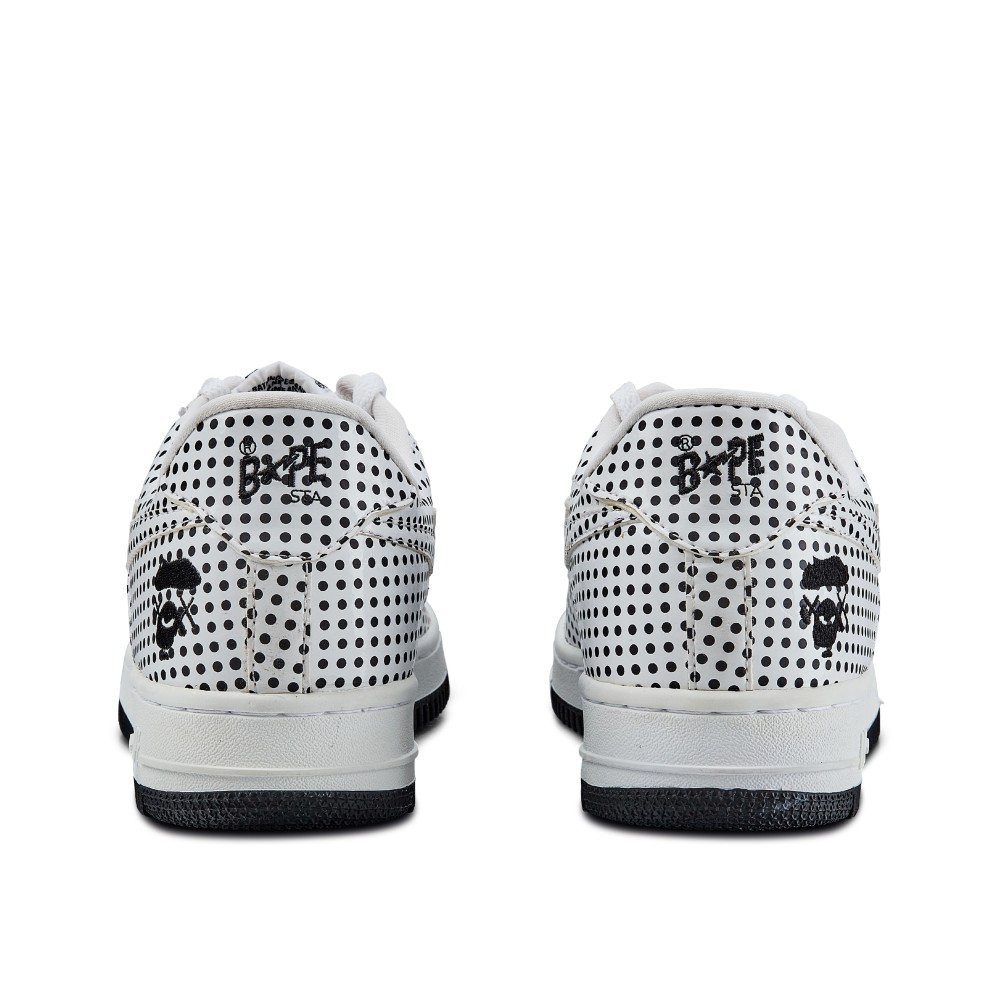 - Black and white polka dot leather upper.