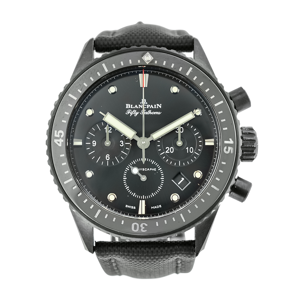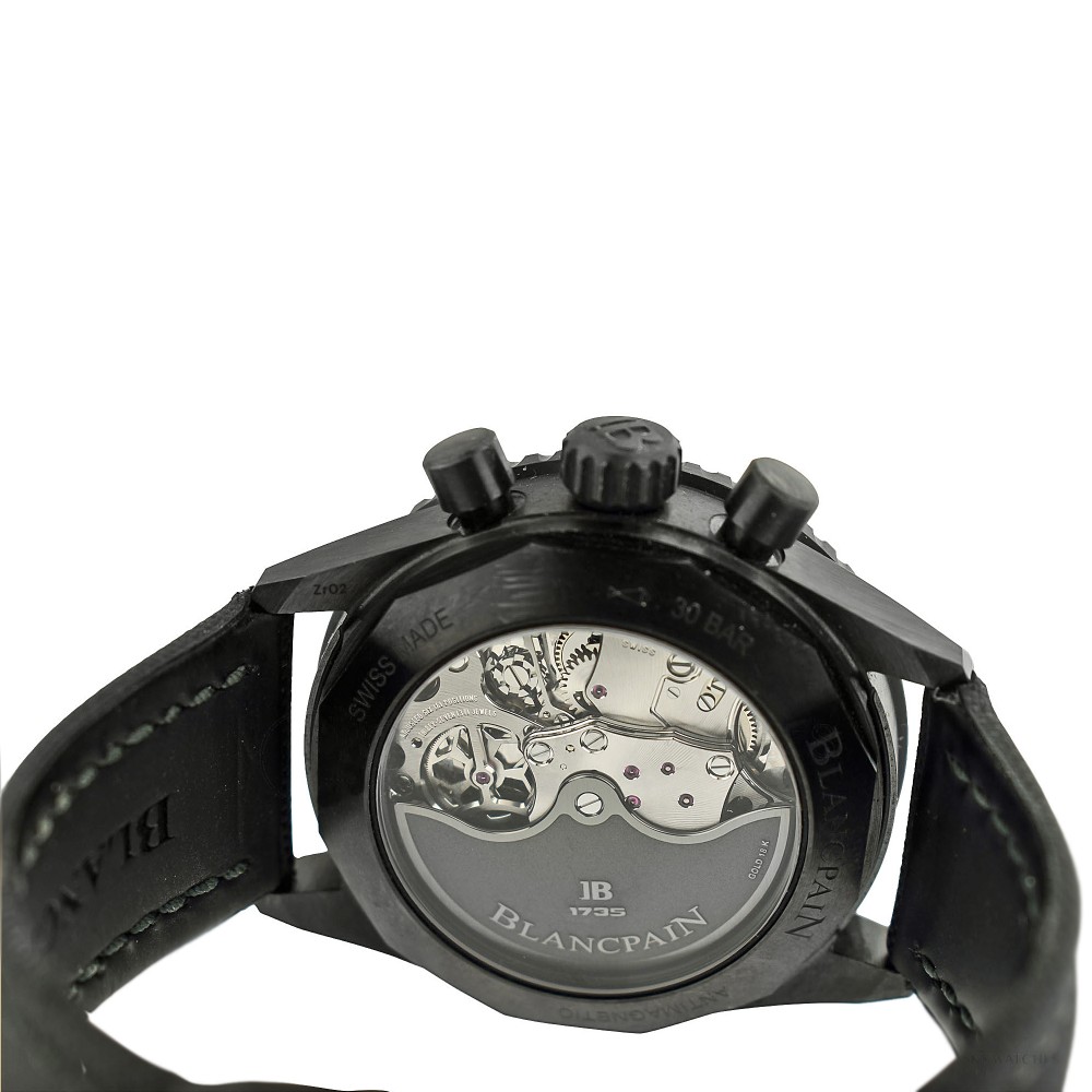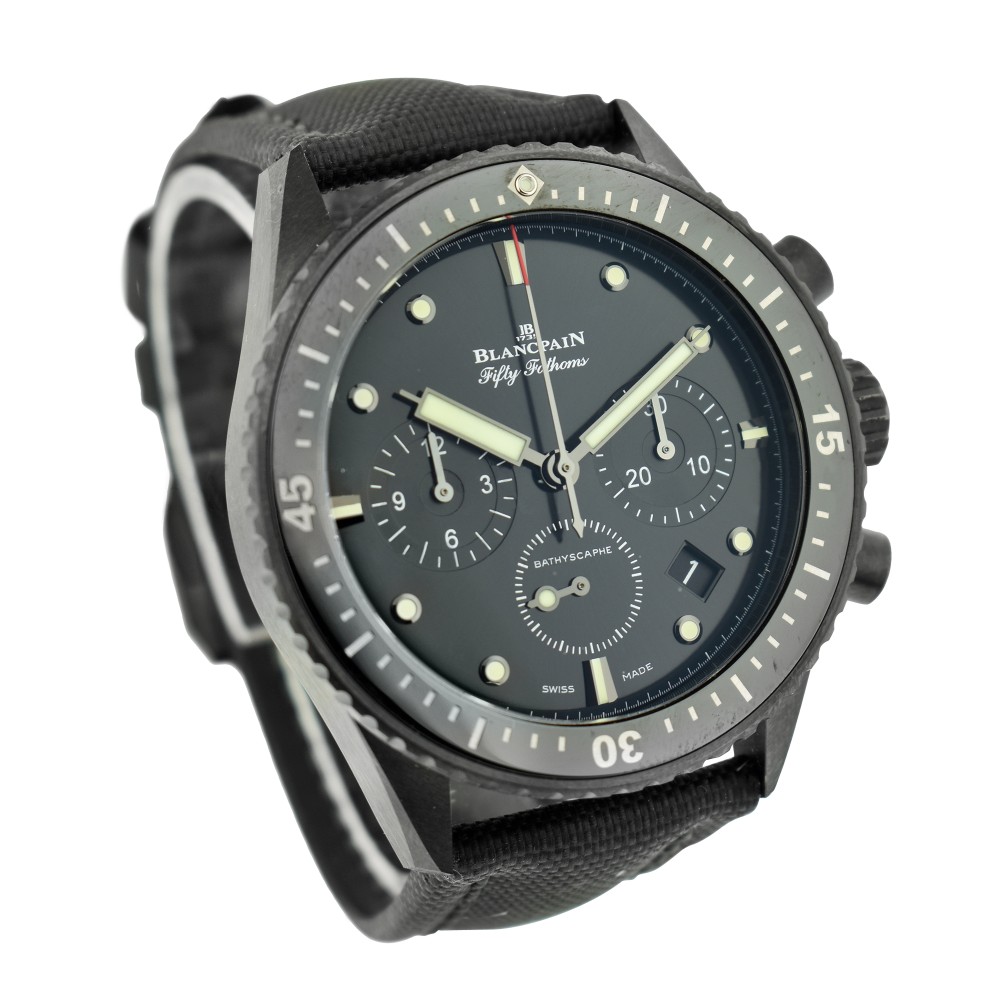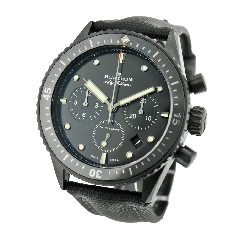 This Blancpain Fifty Fathoms Bathyscaphe is an automatic self-winding watch, a caliber F385 and rhodium plated. There is a shock absorber mechanism built in, a straight line lever escapement and a non-magnetic silicon balance spring. It has a column wheel chronograph with a vertical clutch, 18k oscillating wheel showing the Blancpain logo, and the rotor oscillates at a frequency of 36,000 vibrations per hour.