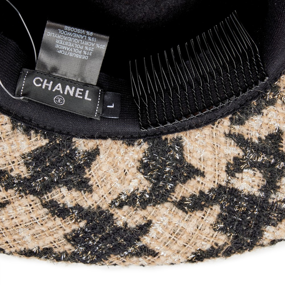 Chanel Beige, Black and Silver Houndstooth Tweed Fedora Hat Size L, 2019