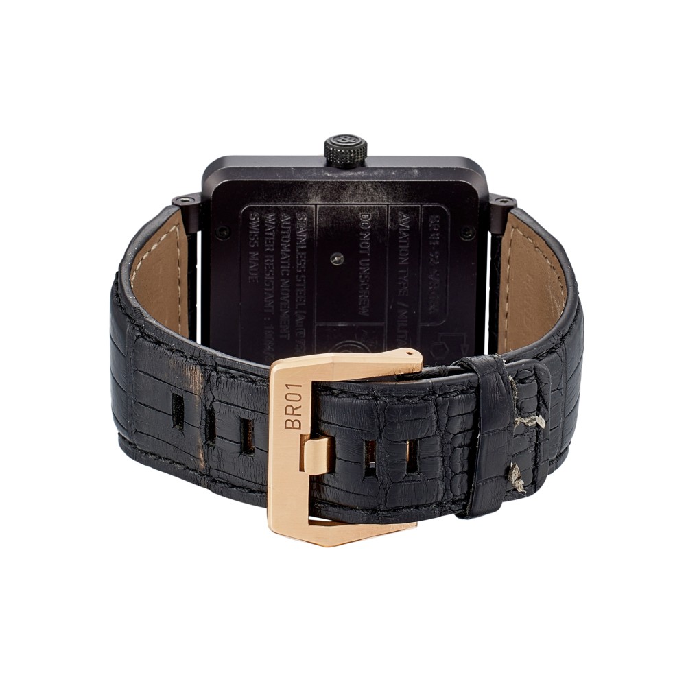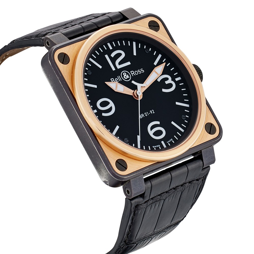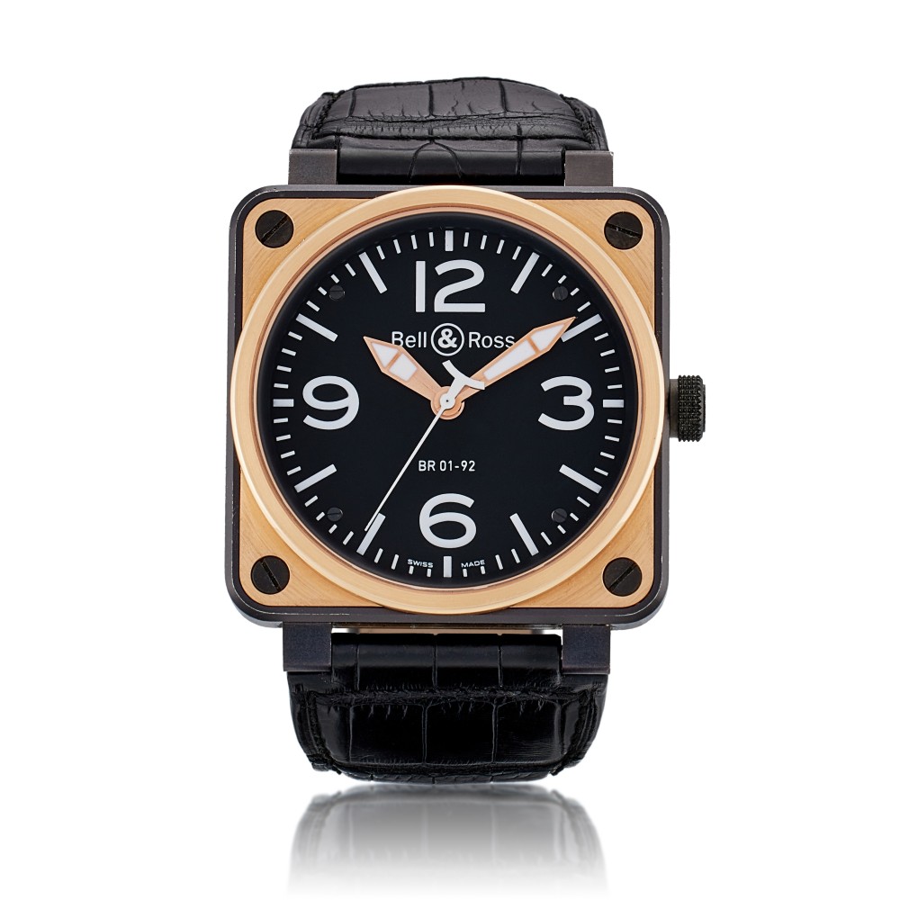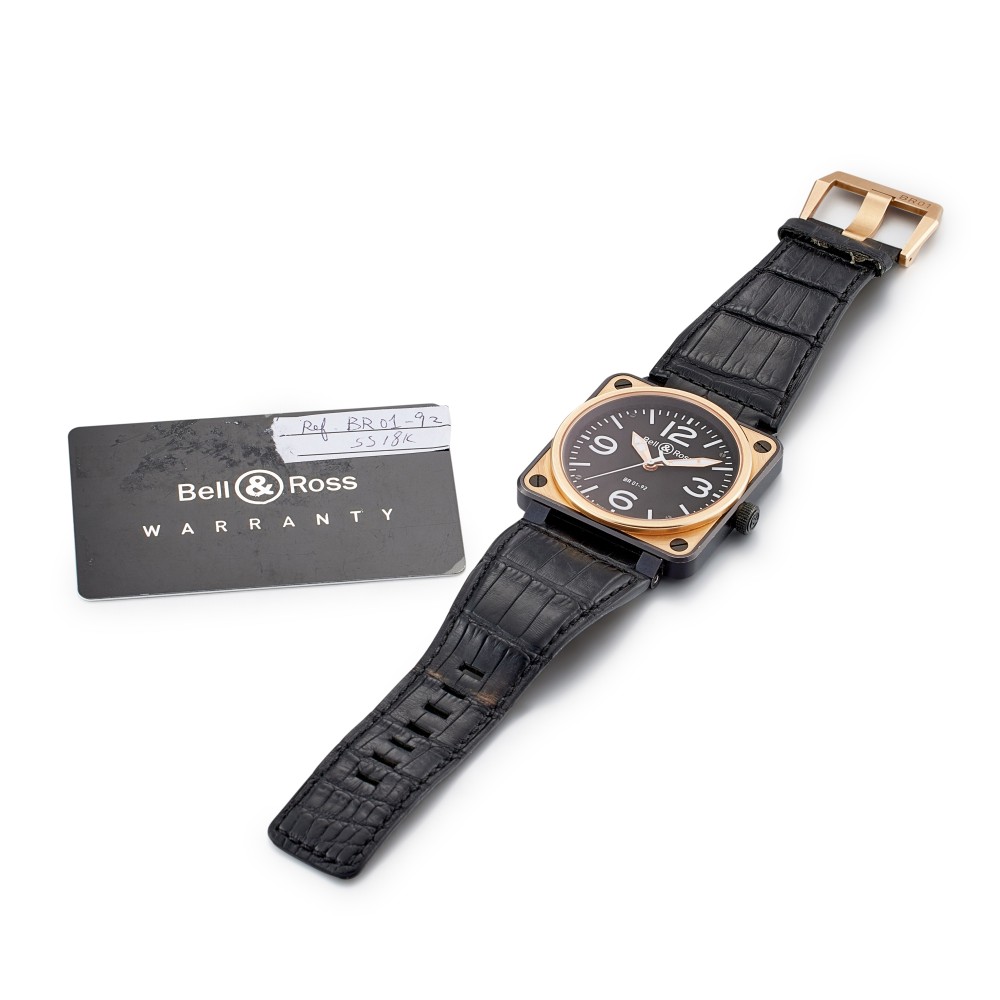 Bell & Ross founded in 1992, bringing functional and reliable timepieces to the wrists of professionals and connoisseurs alike. The vision was shared by its founding members, Bruno Belamich (Bell) and Carlos A. Rosillo (Ross), strongly drawing inspiration from the aviation industry. The French brand began tailoring watches to military specifications, enabling it to stand out amongst its peers. This Reserve De Marche, Reference BR 01-92-S/R, a stainless steel and rose gold automatic wristwatch, index & Arabic numeral hour markers. Black PVD-coated stainless steel case with an 18k rose gold bezel surrounding a black dial. Power reserve approximately 38 hours. Automatic movement. Functions include hours, minutes and seconds. Approximately 100 meters water resistant. With paper only.