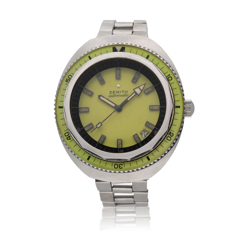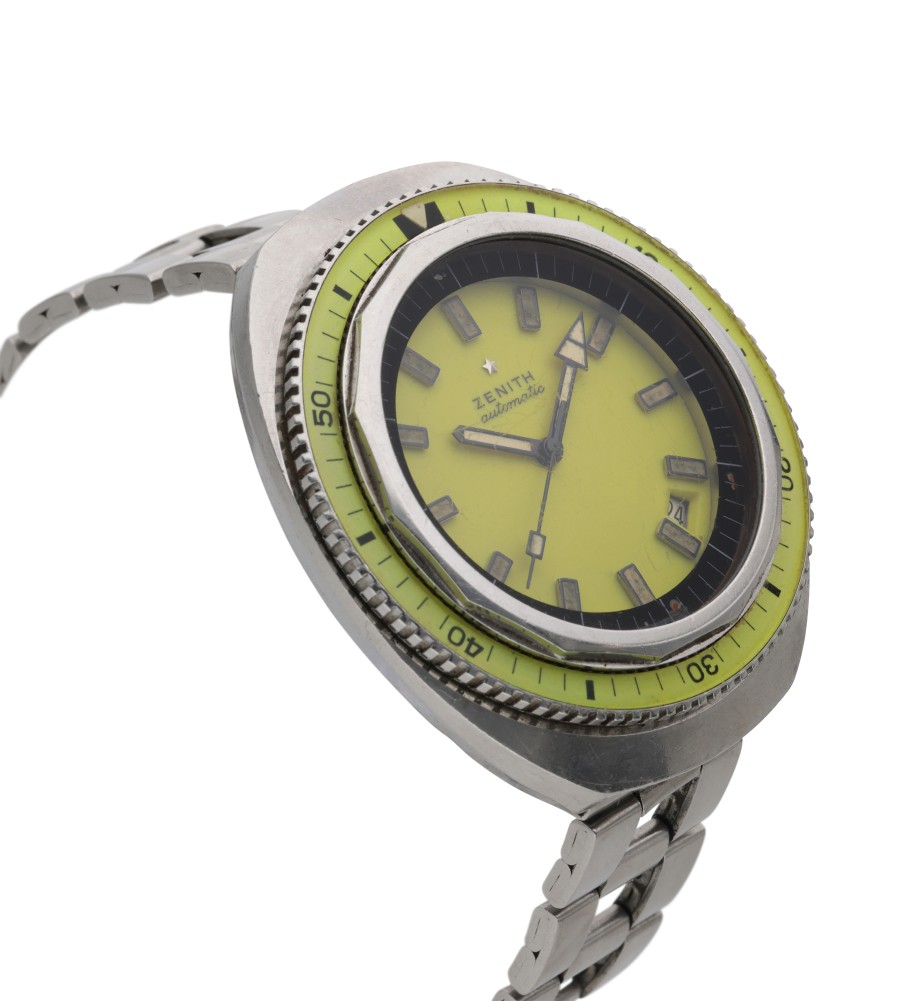 Zenith has been known for precision and accuracy throughout the company’s history. The demand for dive watches grew in the 1960s with the surge of a growing aquatic sport, scuba diving. While many anticipated an obvious air tank and swimsuit as key gear, a timepiece became a necessary accessory to achieve success, as it is essential to keep track of depth and time elapsed under water. With this in mind, they created the “Big Lemon” with its eye-catching dial and bezel for ease to divers.