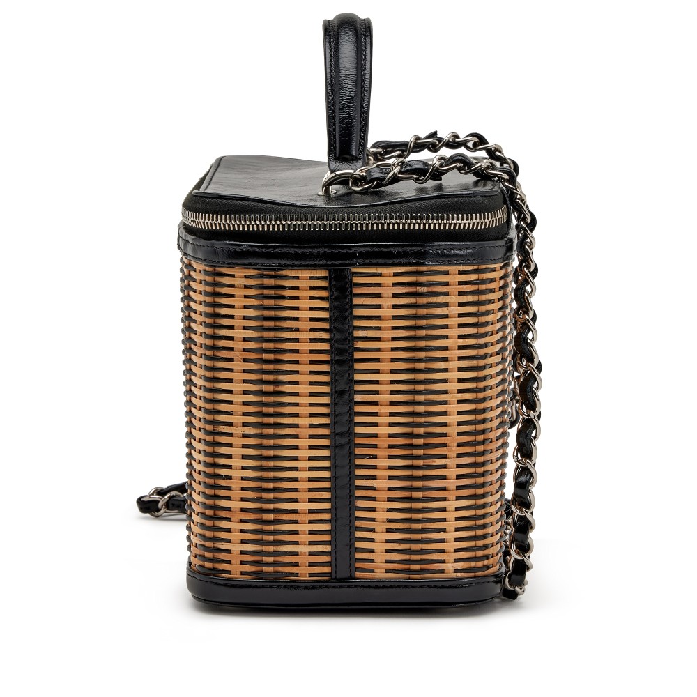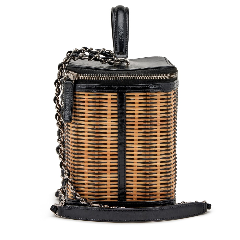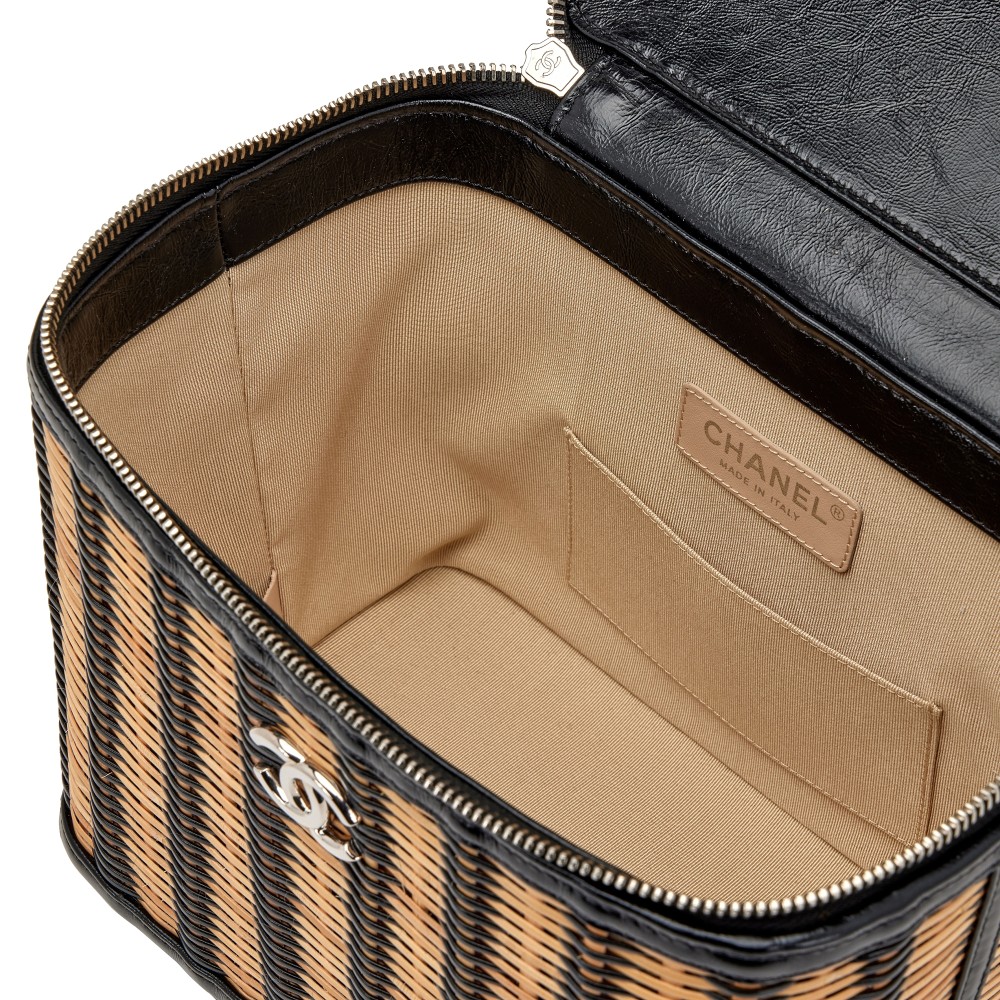 Chanel Black and Beige Raffia, Rattan, and Calfskin Vanity Case Silver Hardware, 2021
