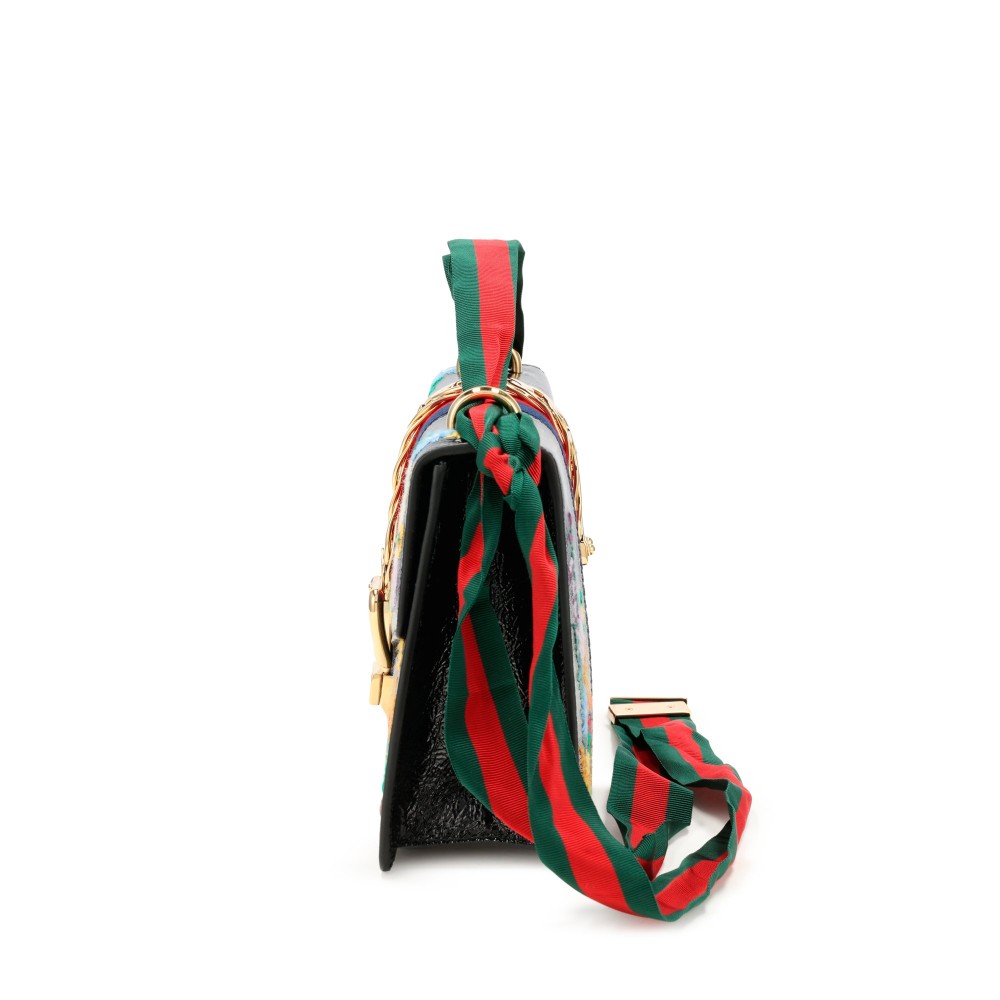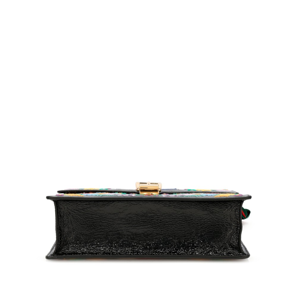 Gucci Black and Multicolor Floral Embroidered Crinkled Patent Leather Sylvie Top Handle Gold Hardware