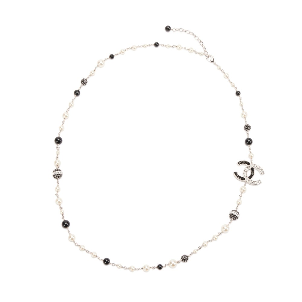 Chanel Black and White Imitation Pearl, Strass and Silver Metal CC Necklace, 2020