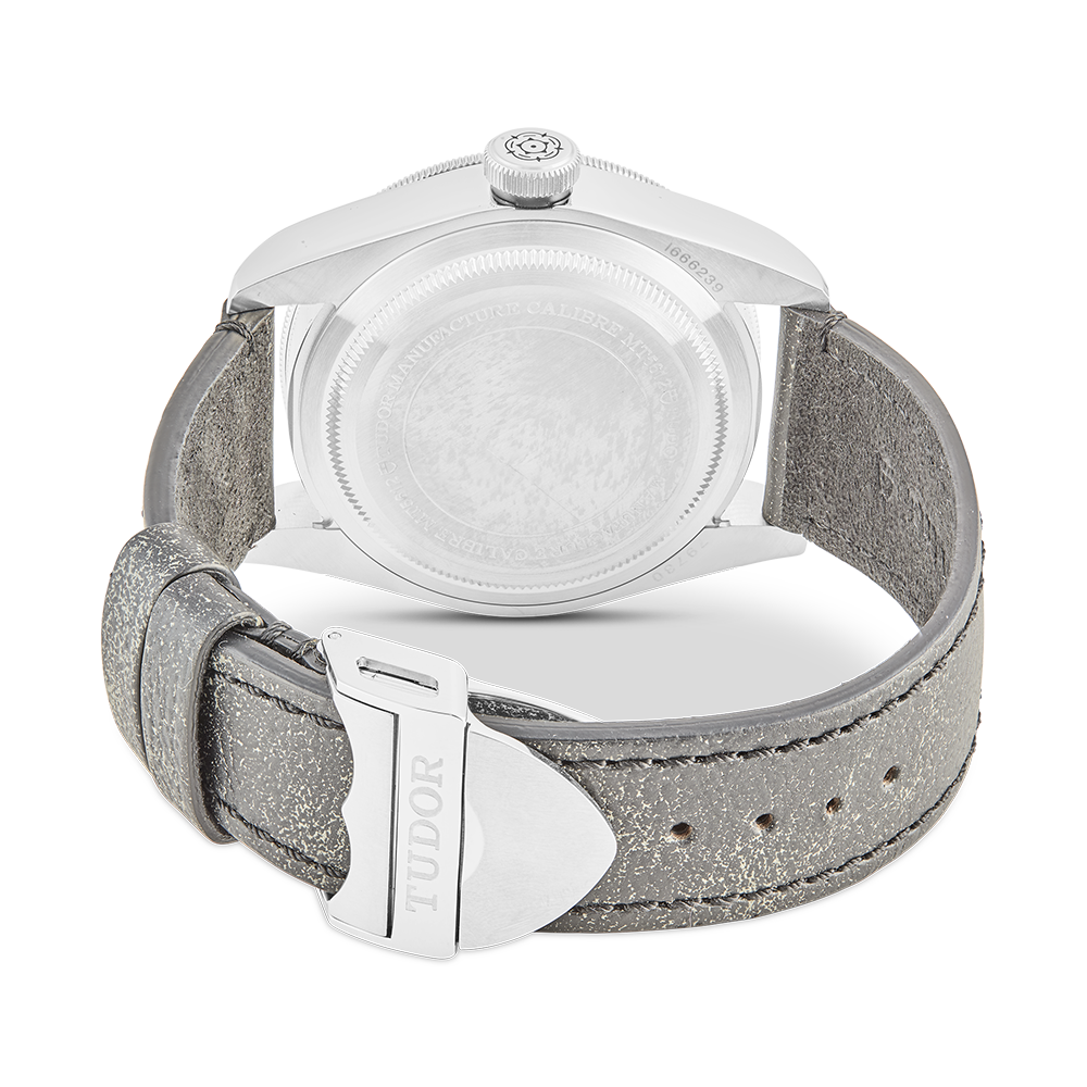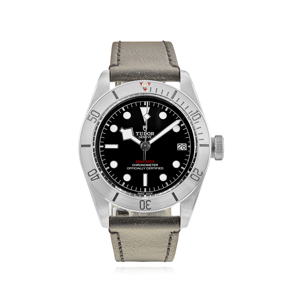 Tudor Black Bay with a 41 mm stainless steel case and a sapphire glass, water-resistant; inside is the automatic caliber mt5612, a black index face with date indication, the bracelet is a bovine leather; accessory: sales box (original).