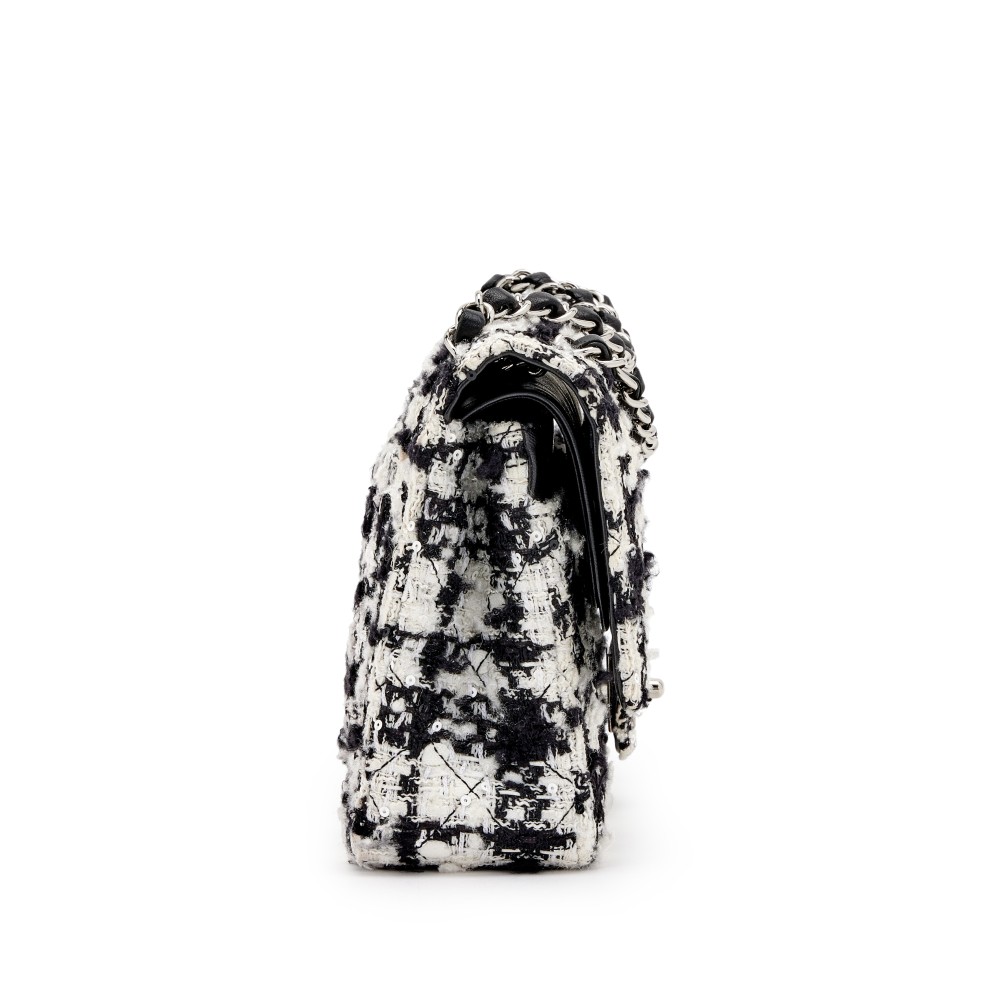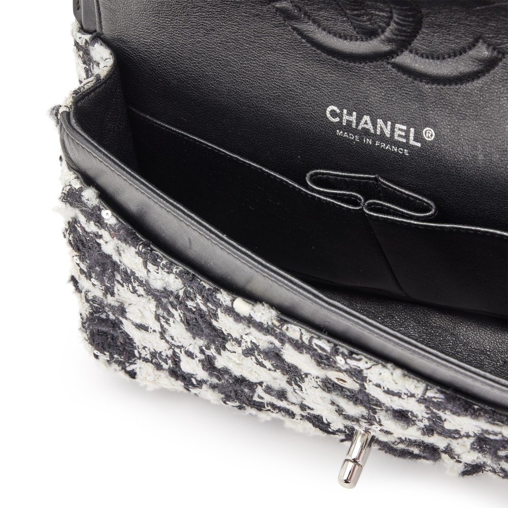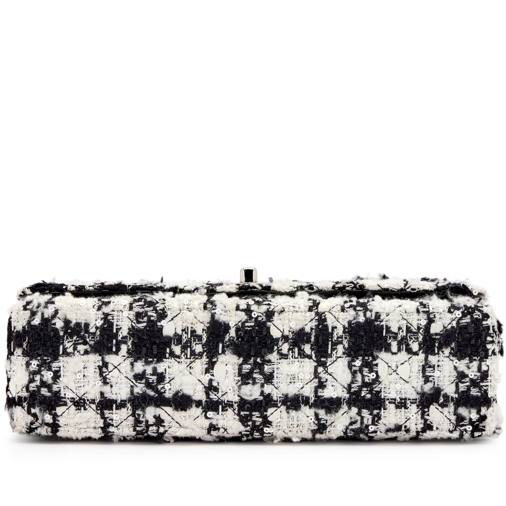 Chanel Black, Ecru and White Quilted Tweed Medium Classic Double Flap Silver Hardware, 2005