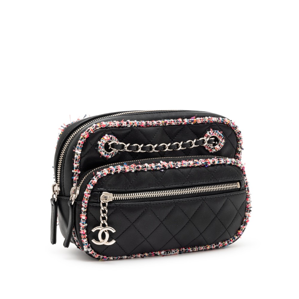Chanel Black Quilted Lambskin and Multicolor Tweed Elegant Trim Camera Bag Silver Hardware, 2019