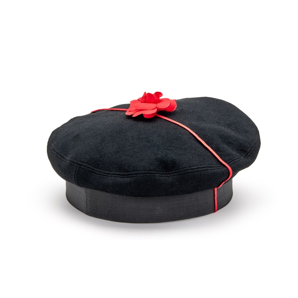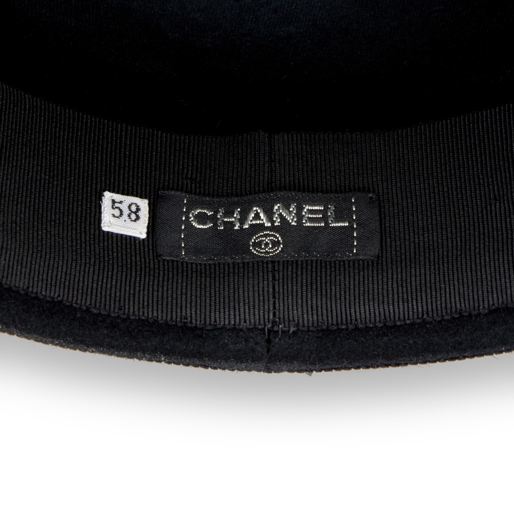 Chanel Black, Red Furfelt Embroidered Oversize Letter Logo Camellia Beret Size 58, 1987