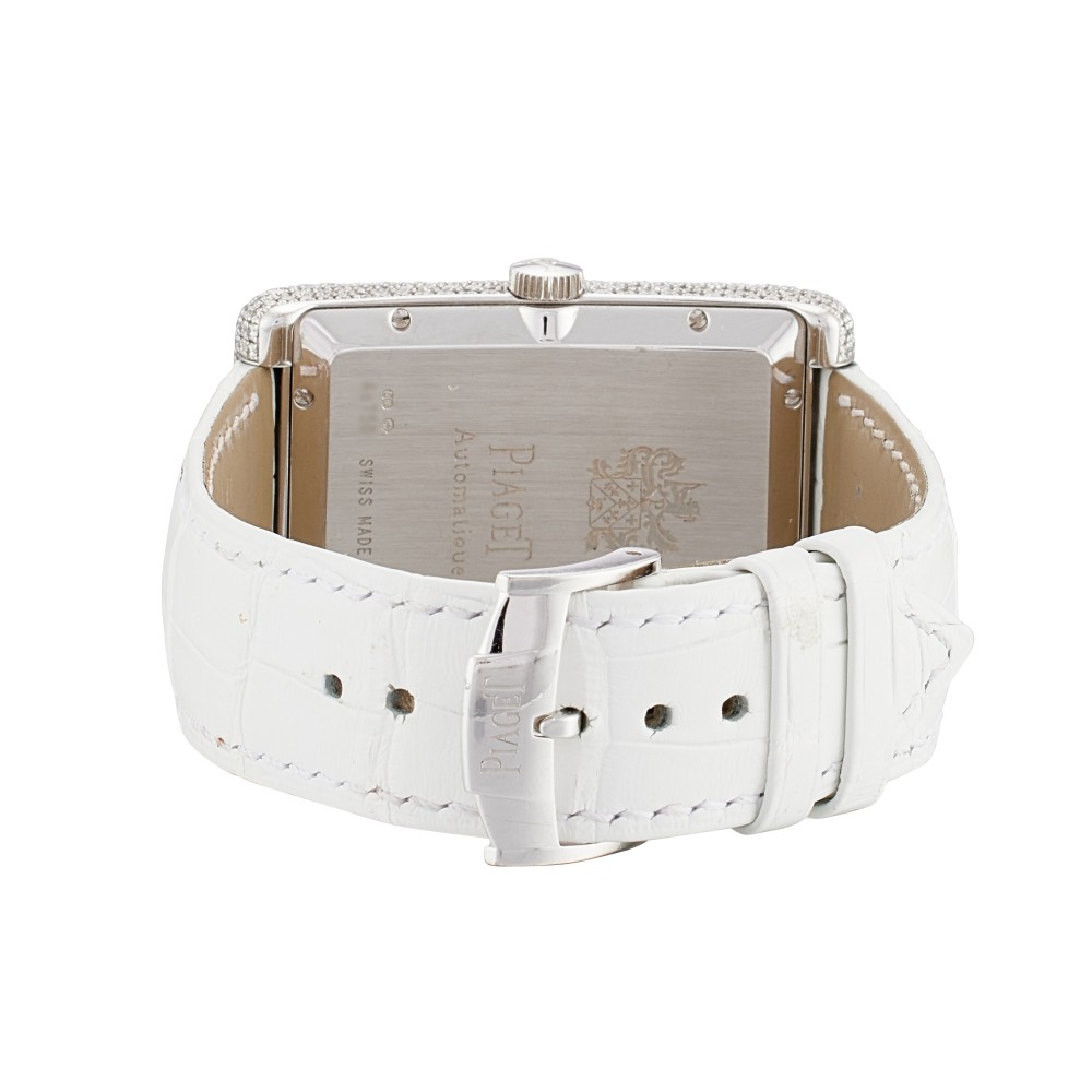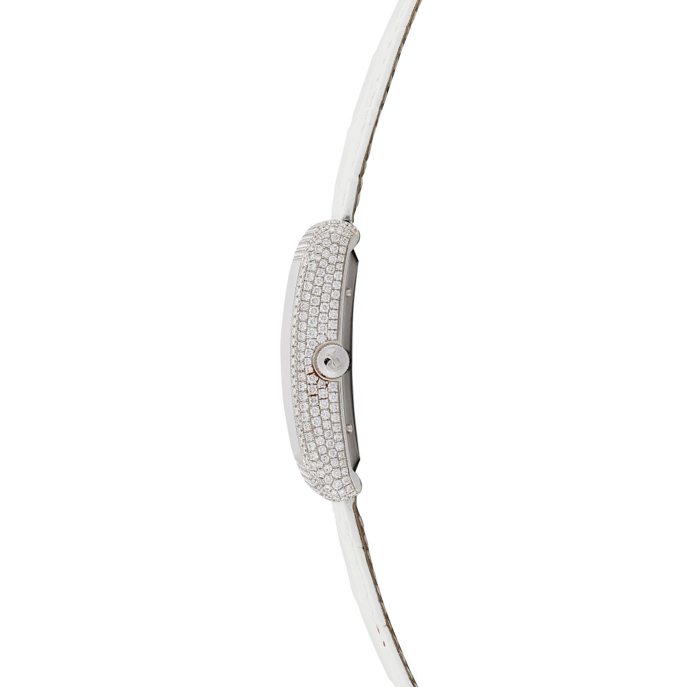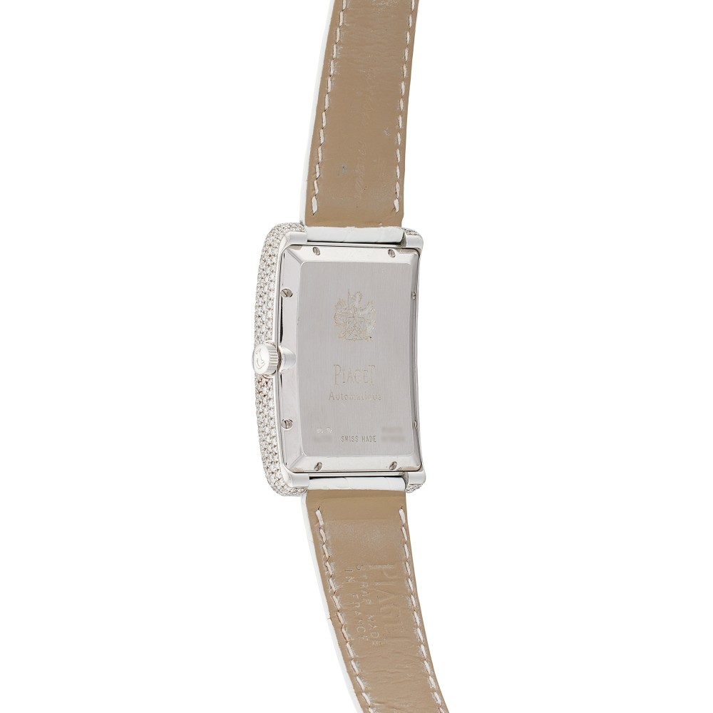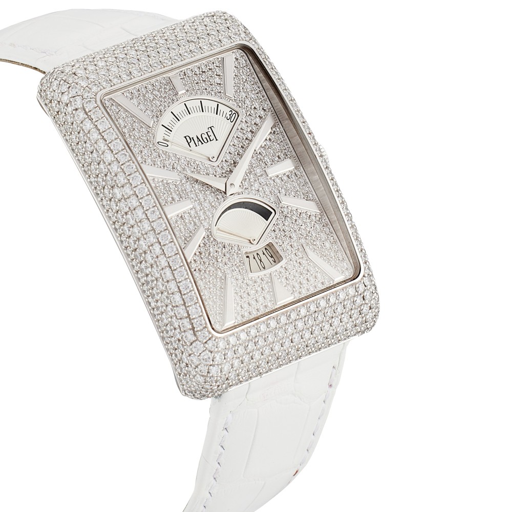 This Black Tie reference GOA33060 is a white gold automatic wristwatch with date and power reserve, circa 2010, with pav?-set diamond dial, automatic movement. Case in 18k white gold and diamond-set, case back secured by 8 screws. White Piaget alligator strap and 18k white gold buckle. Case size in diameter 46×31 mm. Power reserve approximately 40 hours.
