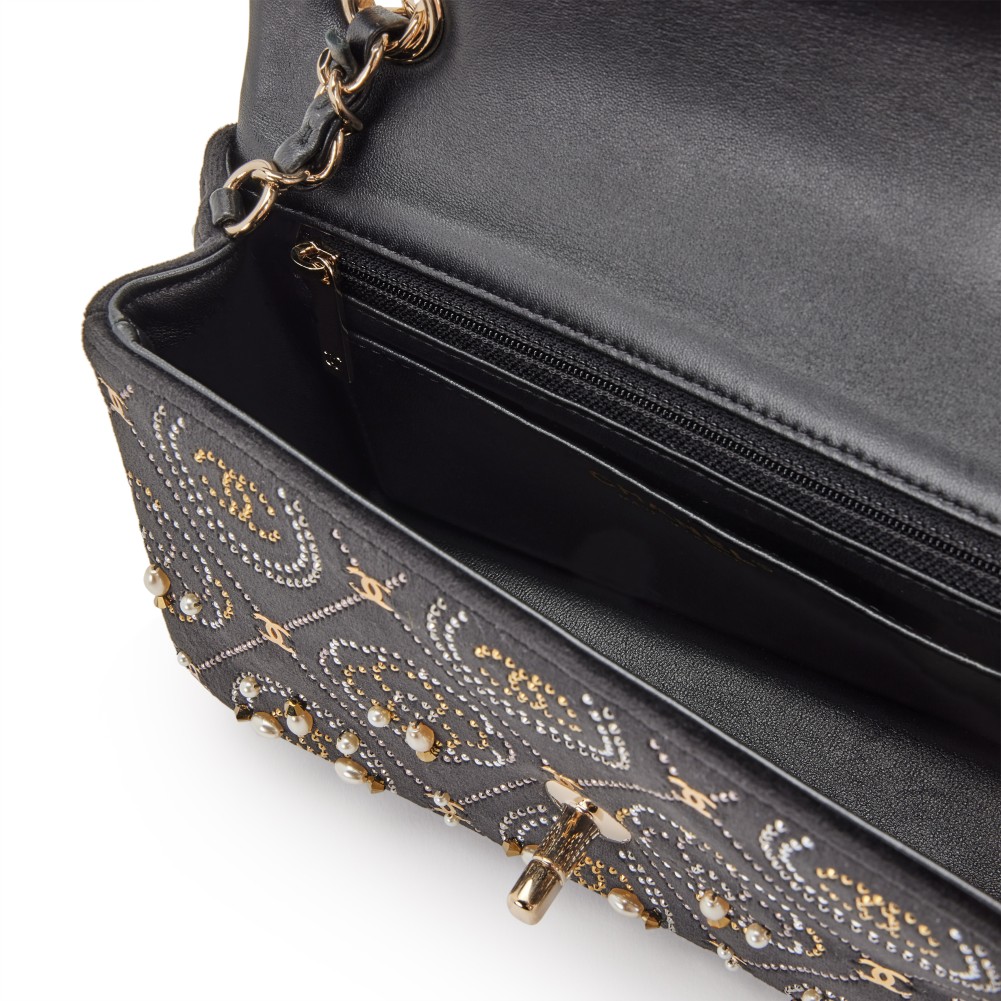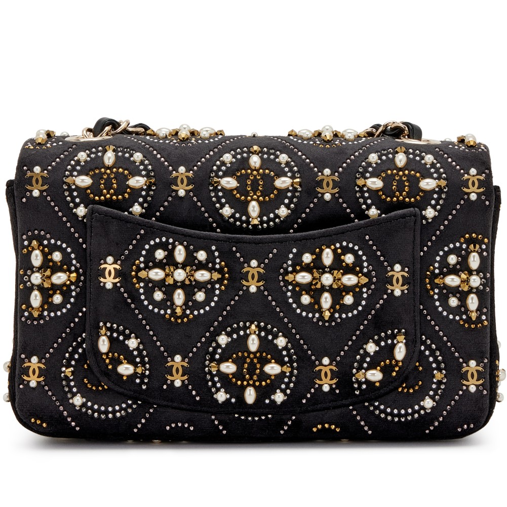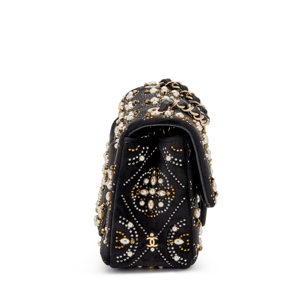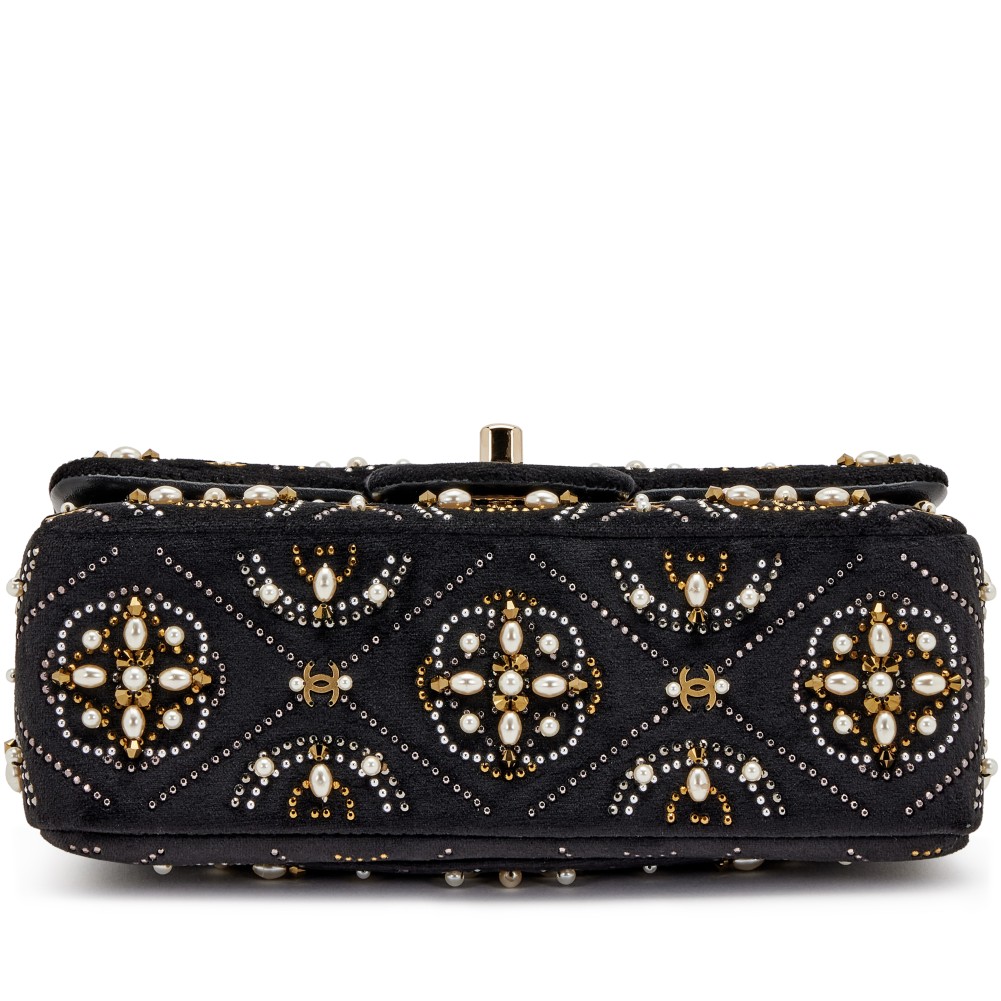 Chanel Black Velvet, Imitation Pearl, Strass CC Embellished Rectangular Mini Classic Flap Gold Hardware, 2020