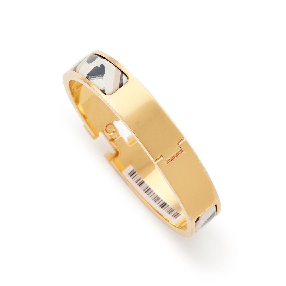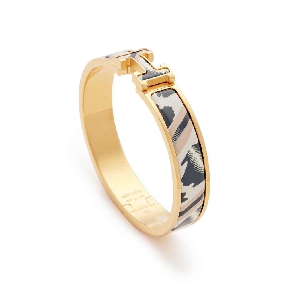 Herm?s Enamel Printed Black White and Grey Le Chat Carre Clic H Bracelet GM Gold Hardware