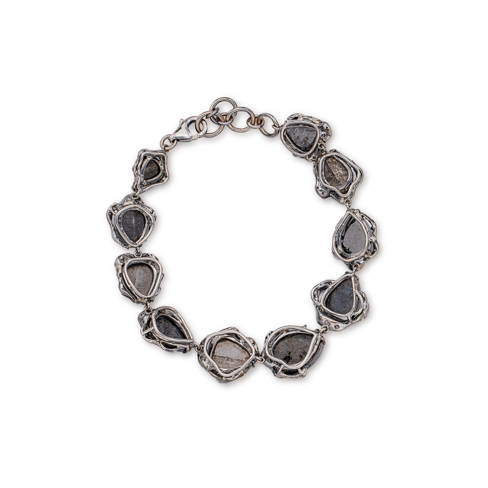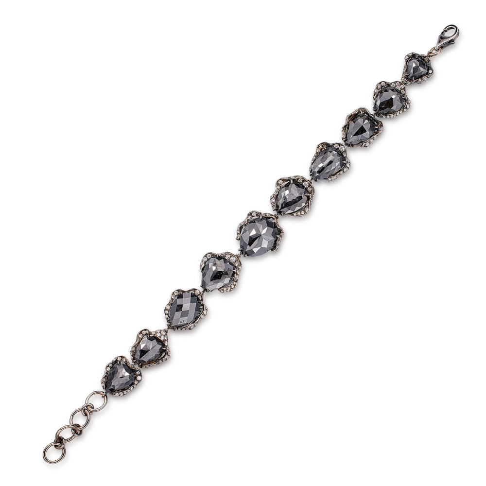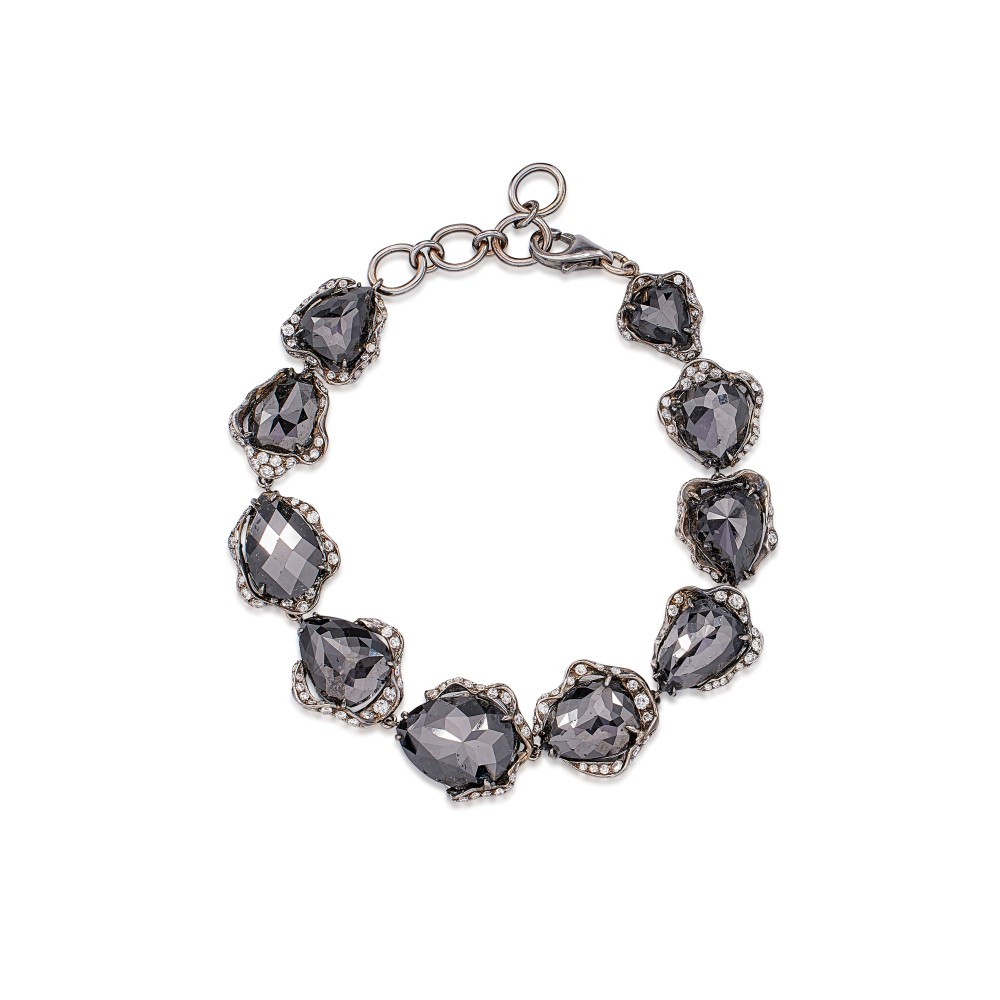 Composed of various-shaped black rose-cut diamonds, each framed by round diamonds.