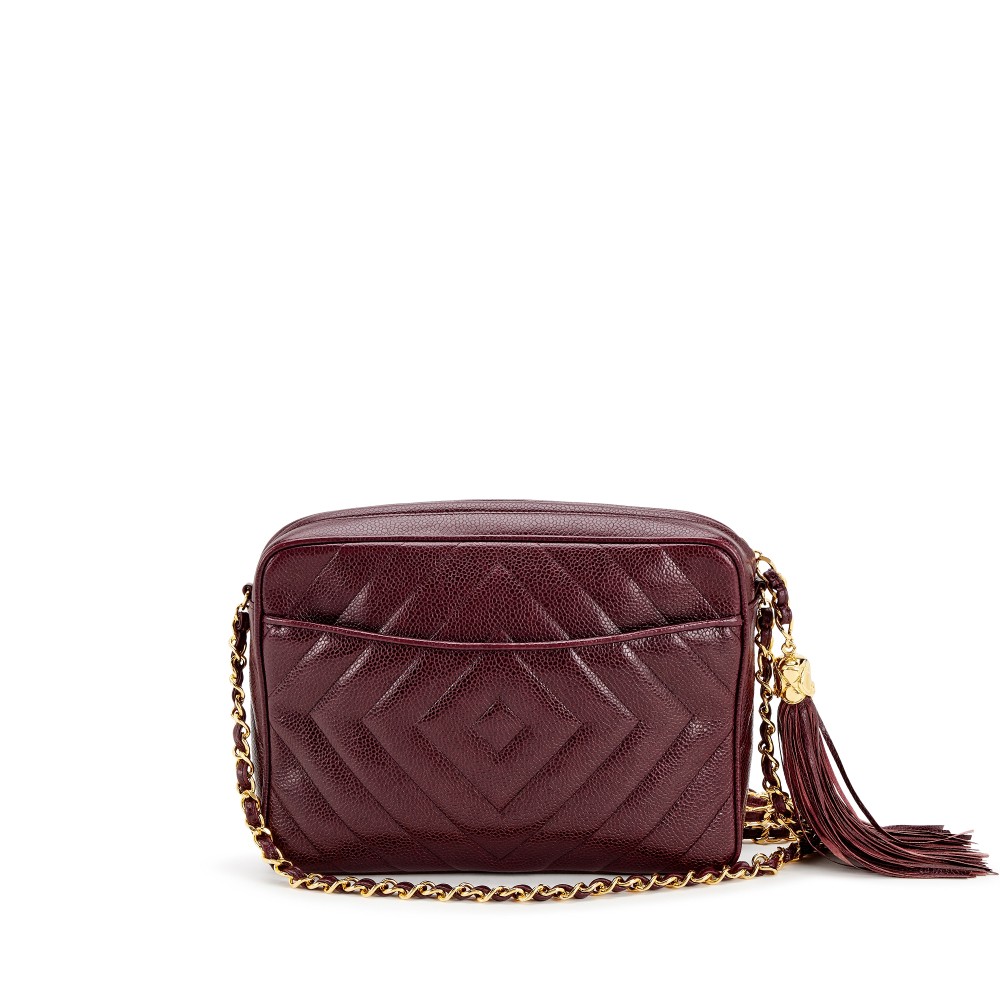 Chanel Burgundy Chevron Diamond Quilted Caviar Tassel Camera Case Gold Hardware, 1991-1994
