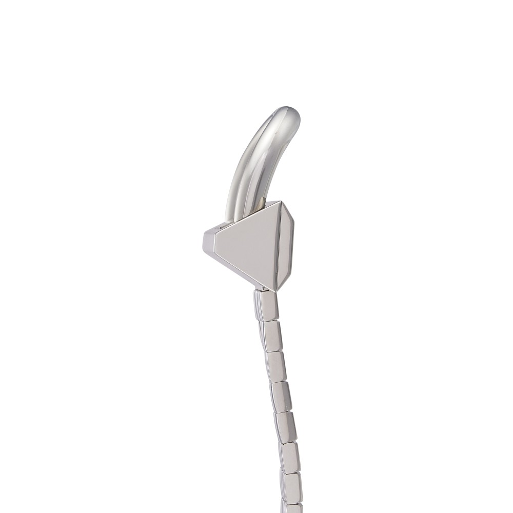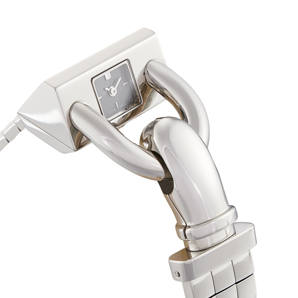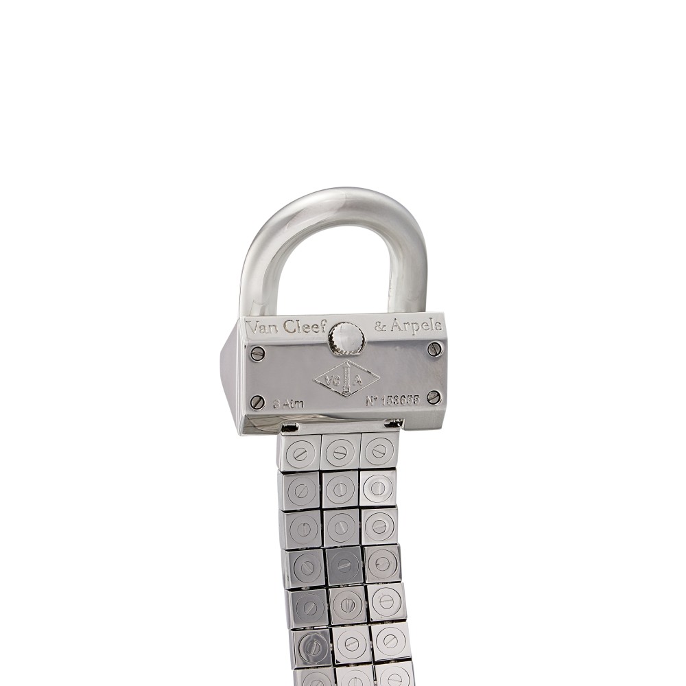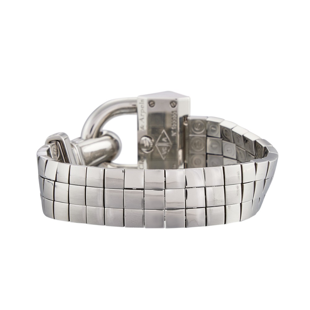 The Cadenas, created in 1935, was inspired by the American socialite Wallis Simpson and has gone on to become one of the most iconic Van Cleef & Arpels watches. This sleek and slinky bracelet watch transports you straight back to the Art Deco era of streamlined, architectural designs and allowed women to consult the time discreetly while enjoying the elegance of a high jewelry bracelet. The original Van Cleef & Arpels Cadenas watch of the 1930s featured a double gold snake chain attached to the wrist by an angular padlock-shaped clasp. Revisited by the maison some 80 years later, some tweaks have been made to the dial, the stone setting and the clasp. The watch, which respects its original inclined position, gains in readability with an enlarged dial and 12 hour markers. This timely revision of one of the most instantly recognizable Van Cleef & Arpels watches of all time is offered in different models presented on gold bracelets or alligator leather straps. This Cadenas features a stainless steel quartz wristwatch, black dial and approximately 30 meters of water resistance. Stainless steel case and bracelet. Case back secured by 4 screws, Caliber 280.002, quartz movement with 5 jewels. With Van Cleef & Arpels pouch only.
