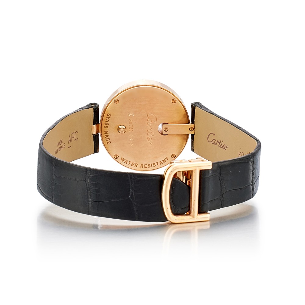 This Captive de Cartier Reference WG600007, a rose gold diamond quartz wristwatch, circa 2010, 18k rose gold case with alligator strap. Fixed bezel with diamond set 18k rose gold. Silvered dial with blued-steel sword-shaped hands, with quartz movement. Unique case shape, case approximately 27mm. Water resistant approximately 30 meters. This watch comes with a full set of paper and box.