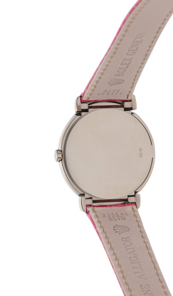 Rolex Cellini Cellissima diamond in 18kt white gold medium with white lacquered Roman dial, white gold dauphine hands, scratch-resistant sapphire crystal, Swiss quartz movement, fitted on a pink alligator leather strap with fold-over deployant buckle, 33mm.