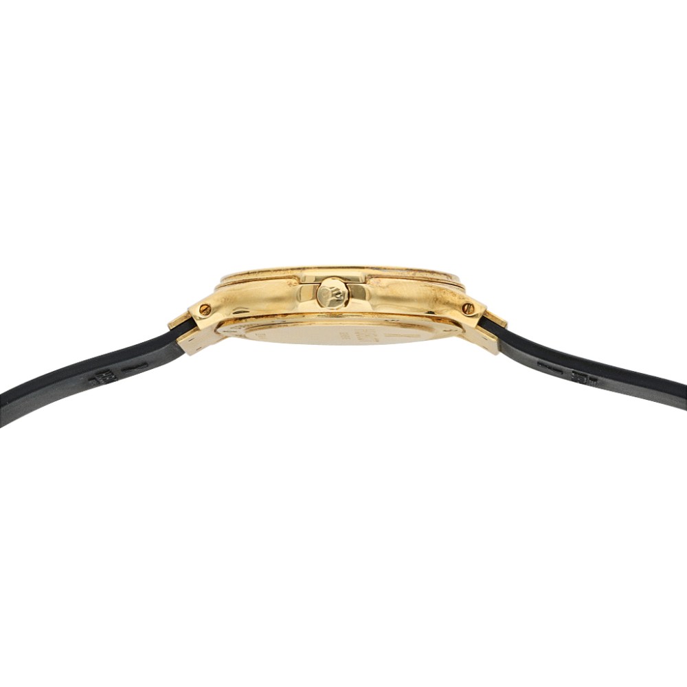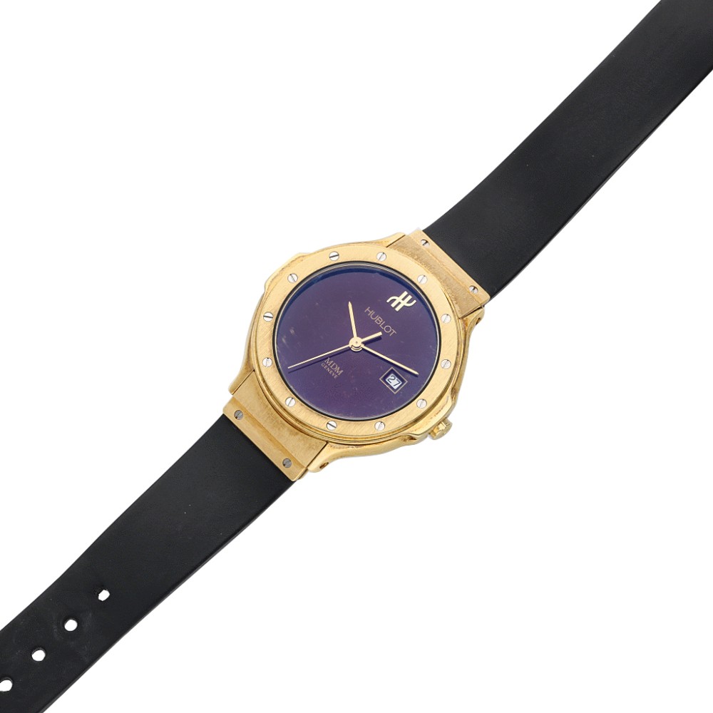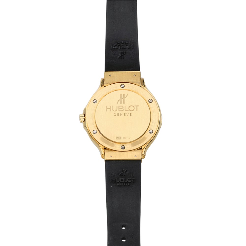 Hublot Classic MDM Fusion in yellow gold with an attractive burgundy dial and black rubber strap. Powered by a Swiss quartz movement in 32mm.