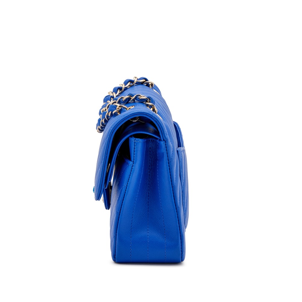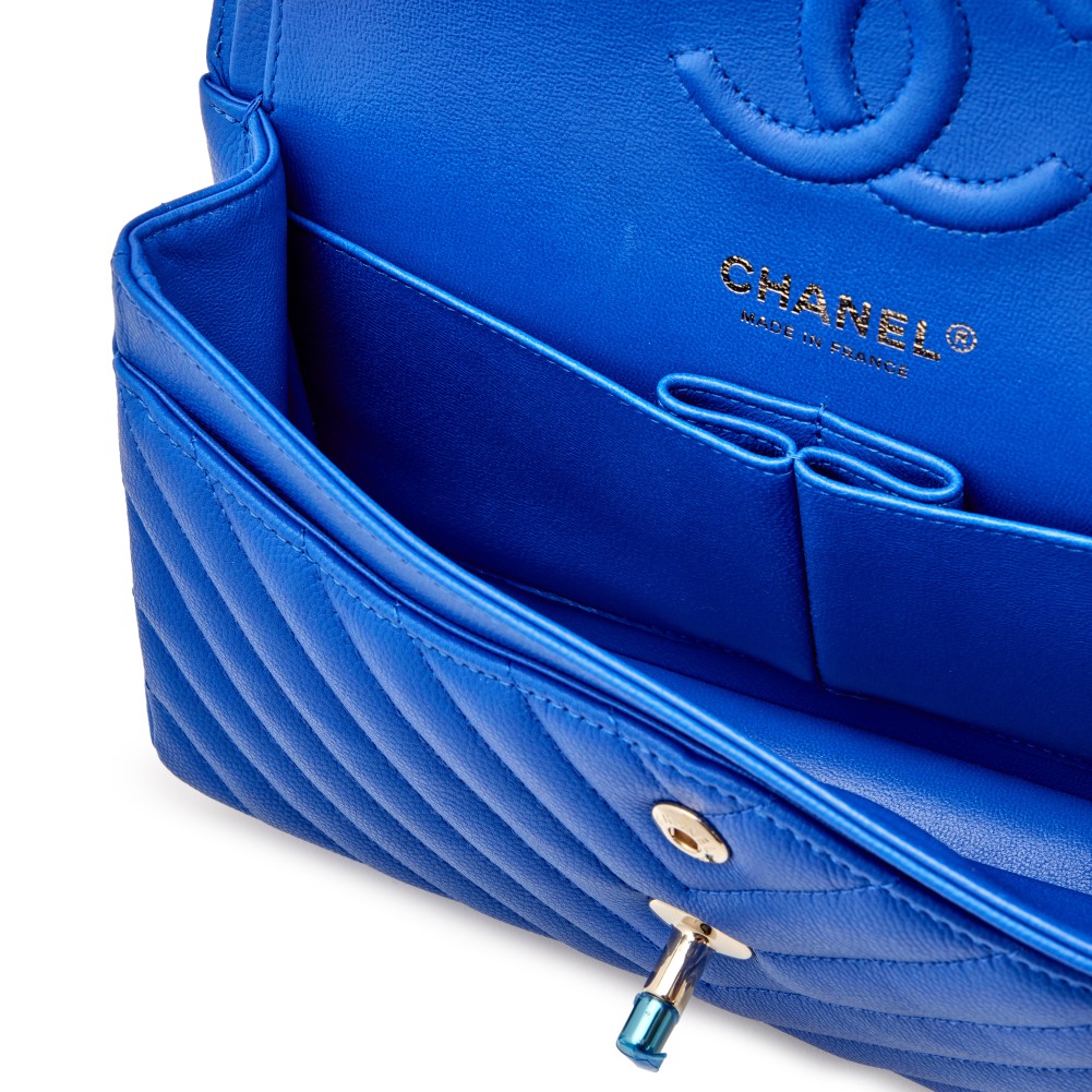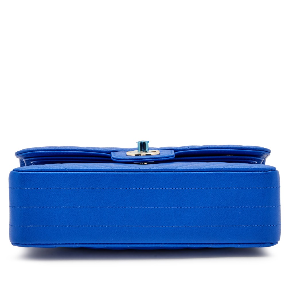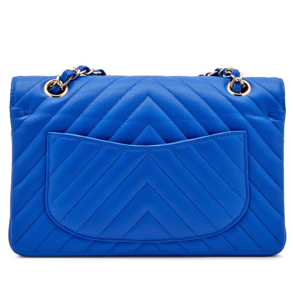 Chanel Cobalt Blue Chevron Caviar Small Classic Double Flap Pale Gold Hardware, 2021