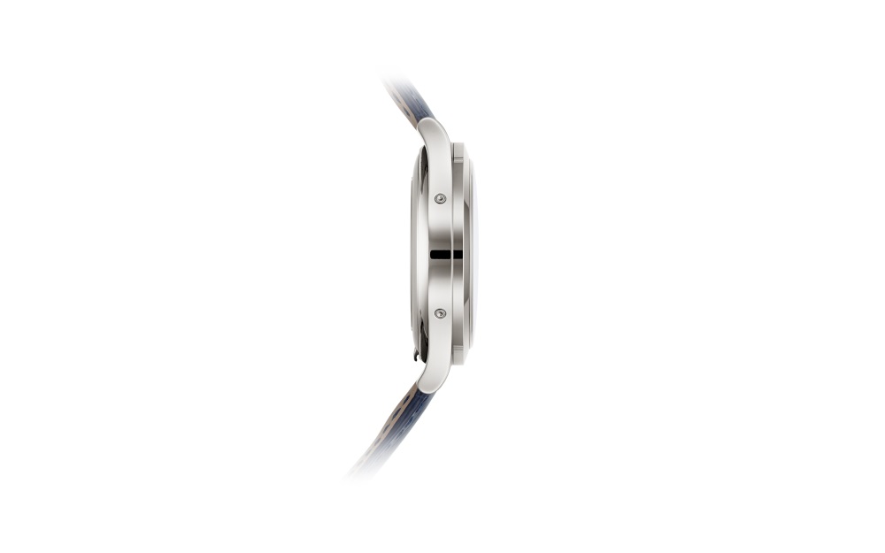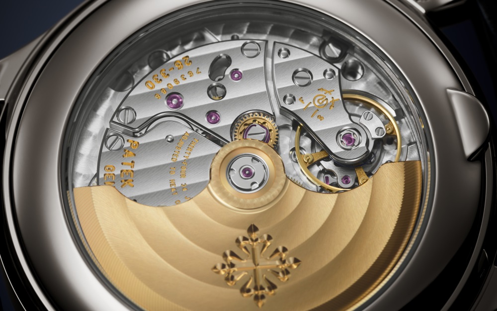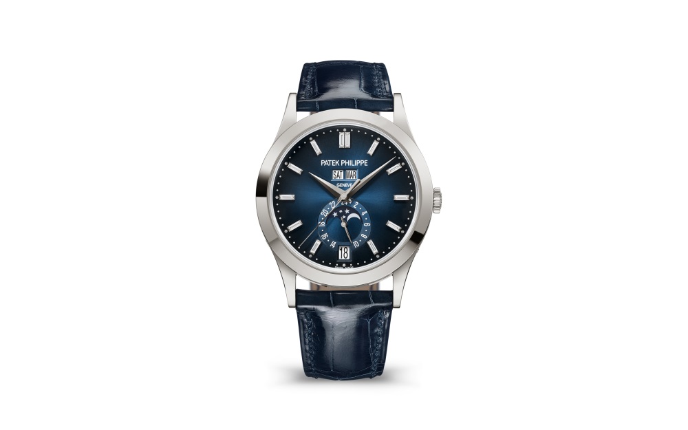 Patek Philippe reinterprets its famous men?s Annual Calendar Reference 5396 in a new white gold version featuring a sunburst blue dial with black-gradient rim, discreetly enhanced by the brilliance of twelve baguette diamond hour-markers (0.26 ct). The dial color is echoed by a shiny navy-blue alligator leather strap.