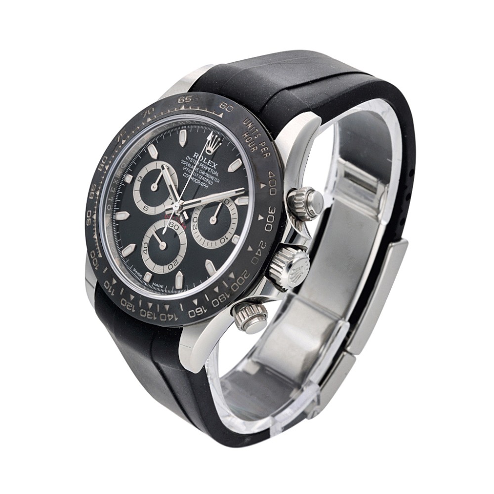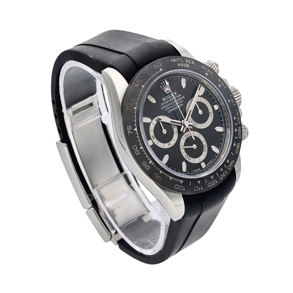 Introduced in 2016, the redesigned Rolex Daytona had a number of notable upgrades including a ceramic Cerachrom Tachymeter timing bezel. Originally designed as a tool for professional race car drivers, the case is equipped with an extremely precise caliber 4130 self-winding movement with a Paramagnetic blue Parachrom hairspring and a 72-hour power reserve. Incredibly hard to acquire new at Rolex, the present watch offers an excellent opportunity for collectors to add this highly desirable piece in attractive condition to their collection.