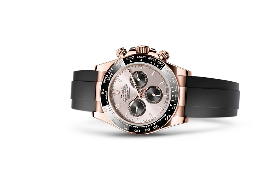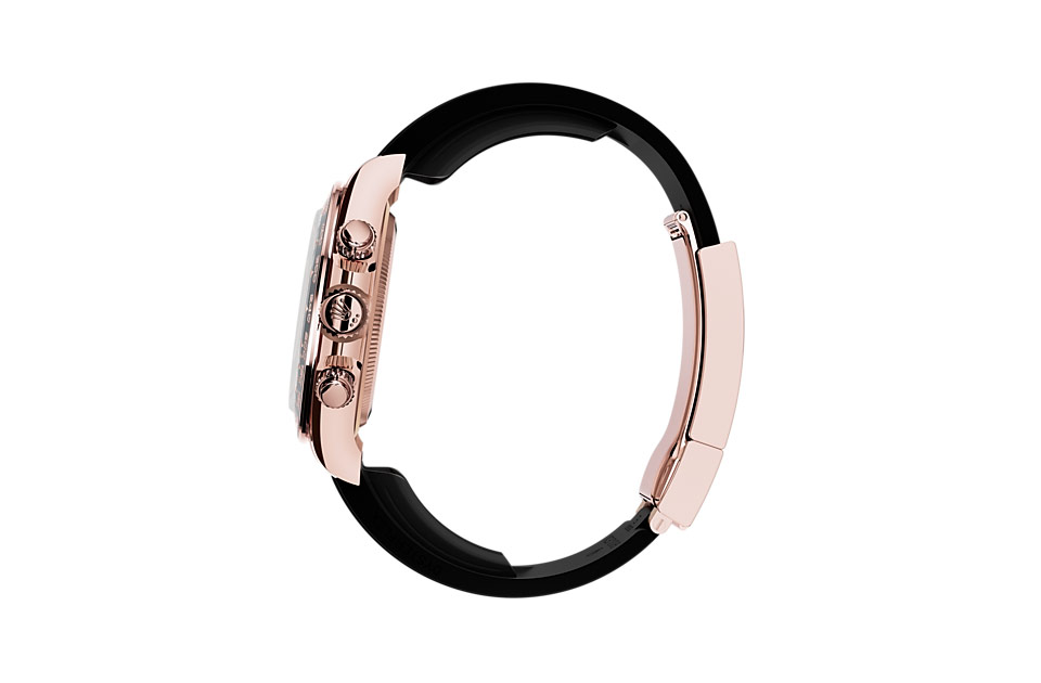 The 18 ct gold versions of the Cosmograph Daytona with a Cerachrom bezel are available with an Oysterflex bracelet. Developed by Rolex and patented, it singularly combines the robustness of a metal bracelet with the comfort of an elastomer bracelet. It is made up of two flexible curved metal blades ? one in each bracelet section ? overmoulded with high-performance black elastomer. For optimum comfort, the Oysterflex bracelet is equipped with cushions on its inner sides and an Oysterlock safety clasp to prevent accidental opening. Its length may be adjusted via the ingenious Rolex Glidelock extension system.