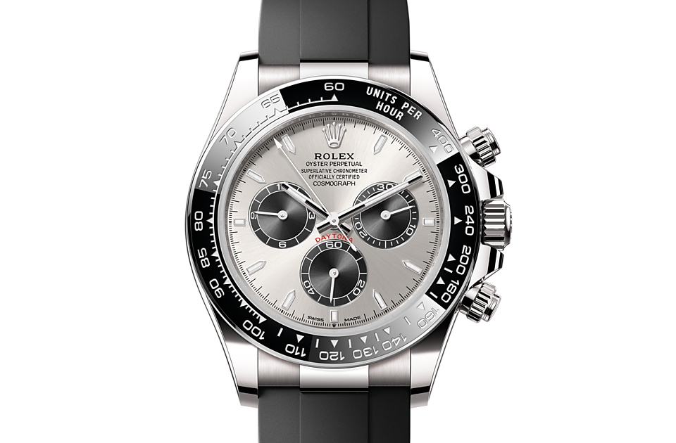 The 18 ct gold versions of the Cosmograph Daytona with a Cerachrom bezel are available with an Oysterflex bracelet. Developed by Rolex and patented, it singularly combines the robustness of a metal bracelet with the comfort of an elastomer bracelet. It is made up of two flexible curved metal blades ? one in each bracelet section ? overmoulded with high-performance black elastomer. For optimum comfort, the Oysterflex bracelet is equipped with cushions on its inner sides and an Oysterlock safety clasp to prevent accidental opening. Its length may be adjusted via the ingenious Rolex Glidelock extension system.