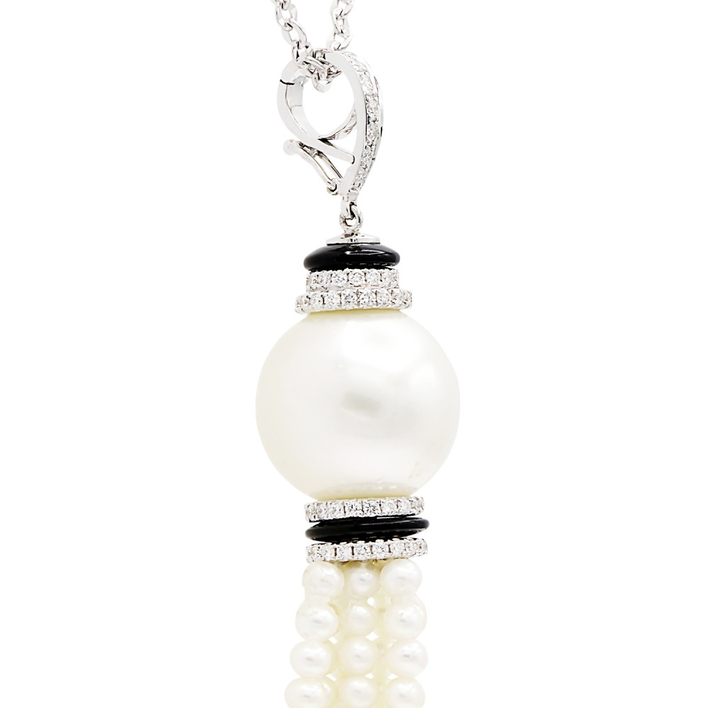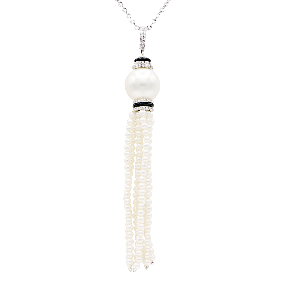 The long chain suspending a tassel composed of a South Sea white cultured pearl accented with black onyx, diamonds and seed pearls.