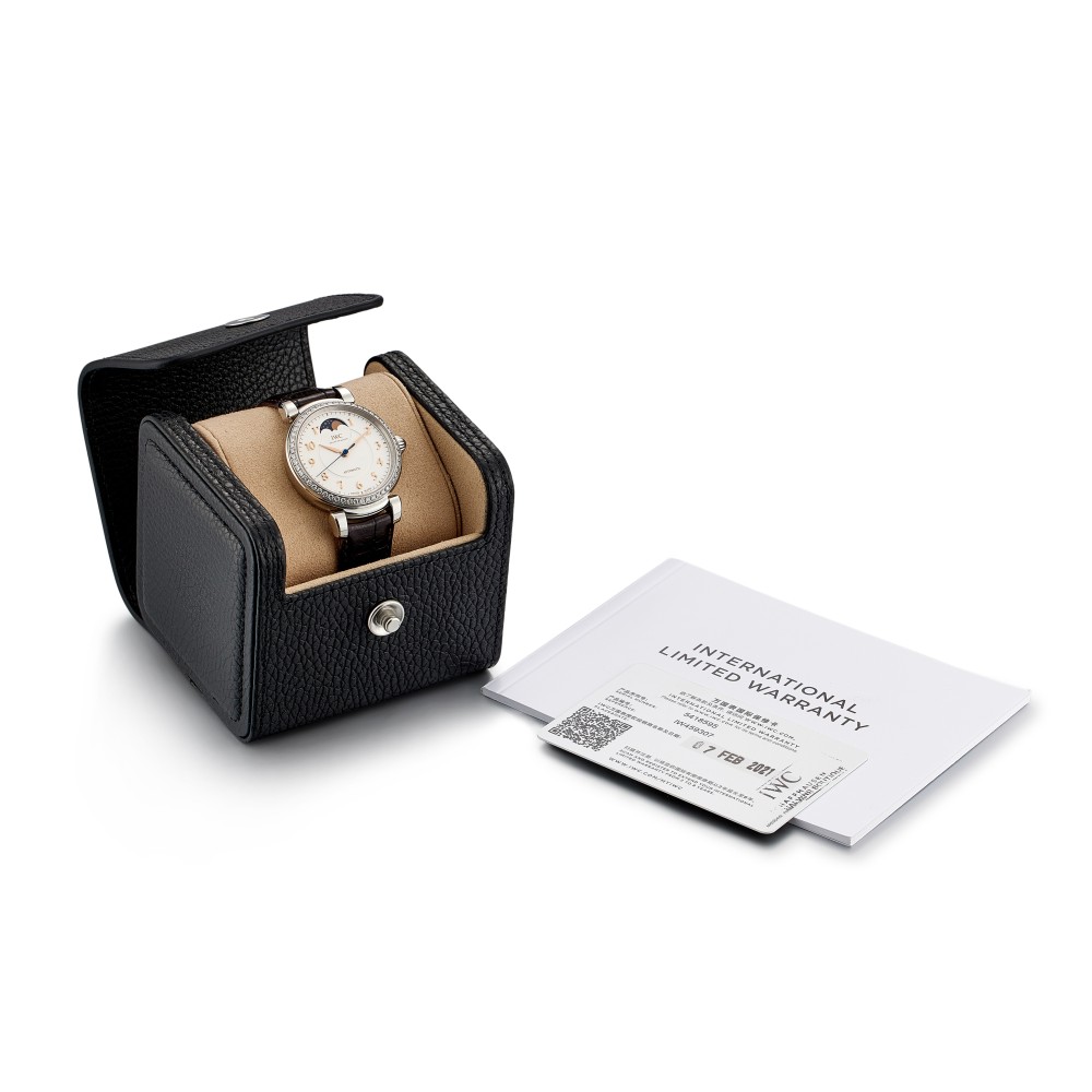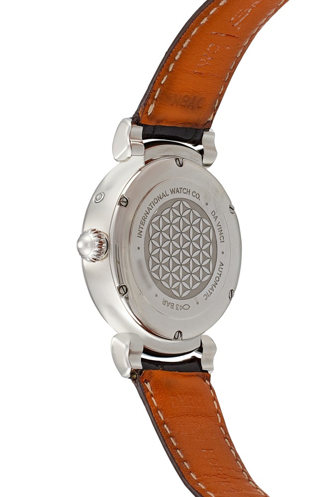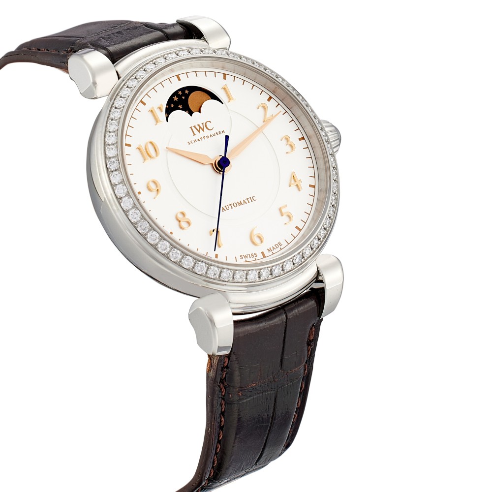 This Da Vinci reference IW459307 is an automatic wristwatch with moon phase, circa 2017, stainless steel case with diamond, in diameter 36 mm, water resistance approximately 30 meters. Automatic movement caliber 35800, frequency 28800.0 VPH (4.0 Hz) and 25 jewels, power reserve approximately 42 hours. Central hacking seconds, sapphire glass, convex, antireflective coating on both sides. Moon phase display and silver dial. Dark brown alligator leather strap with fold clasp. This watch comes with paper and box.