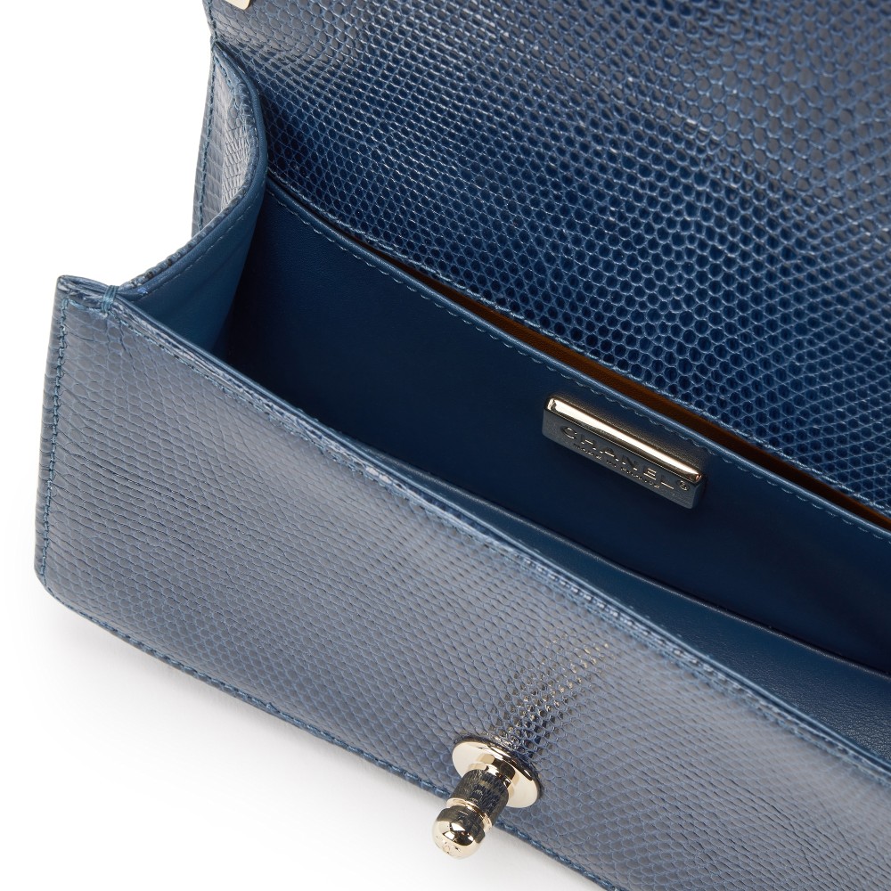 - The interior is lined in a dark blue leather