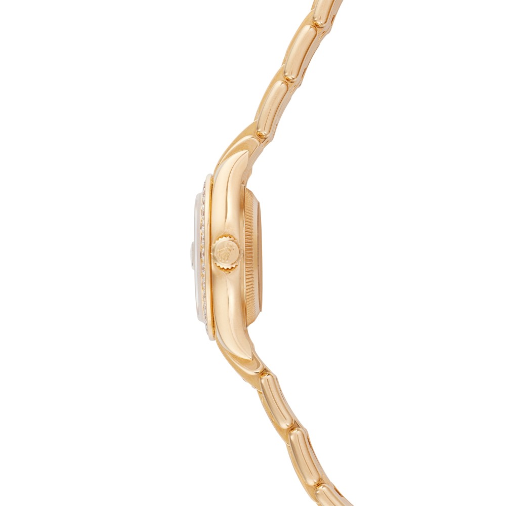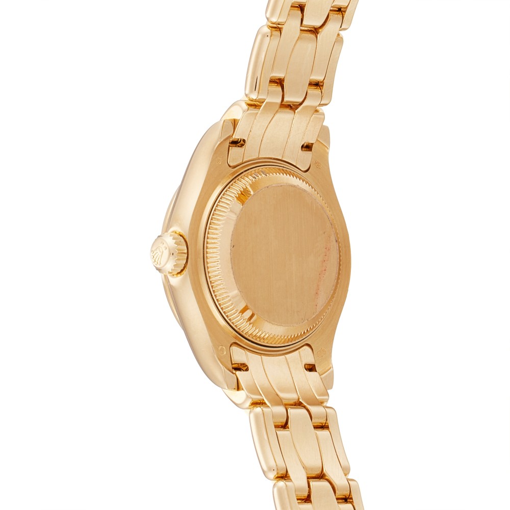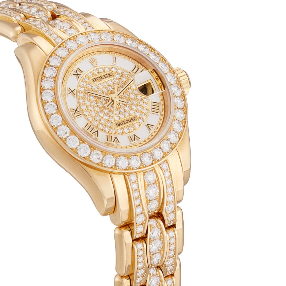 This Datejust Pearlmaster reference 80298 is a yellow gold automatic wristwatch with date, circa 2000, automatic movement caliber 2235 with 31 jewels. 18K yellow gold case and bracelet with diamond set. Screw-down case back. Mother of pearl with diamond-paved central dial and Roman numerals. This watch comes with paper and box.