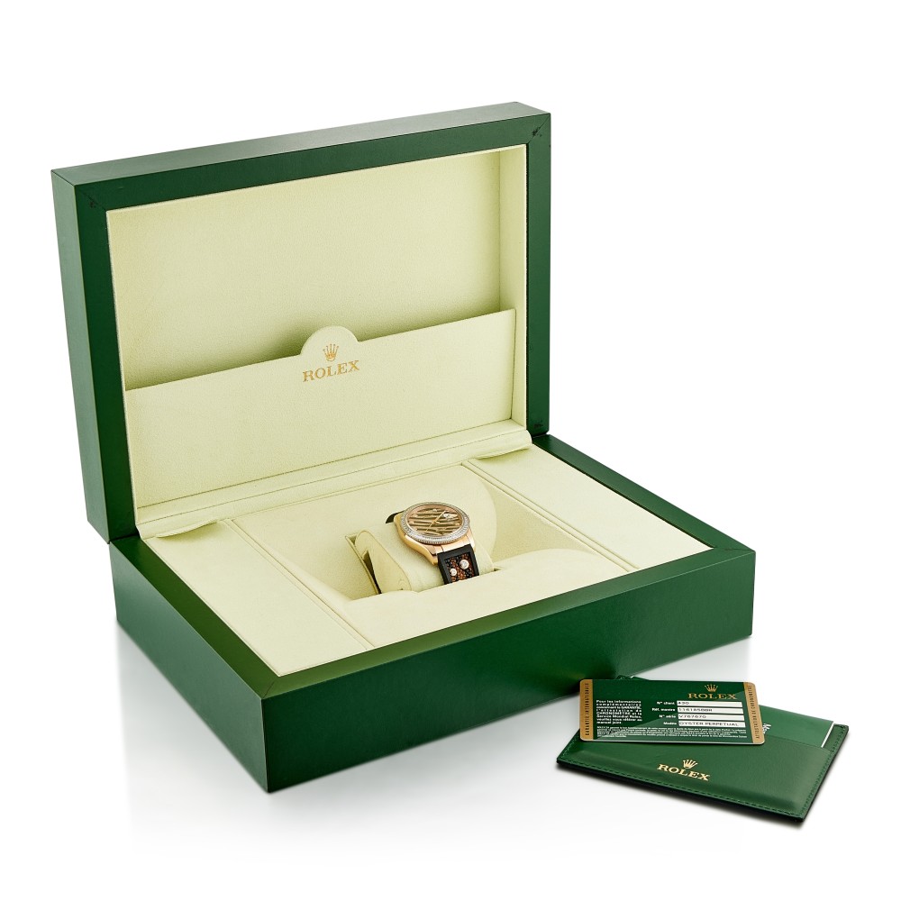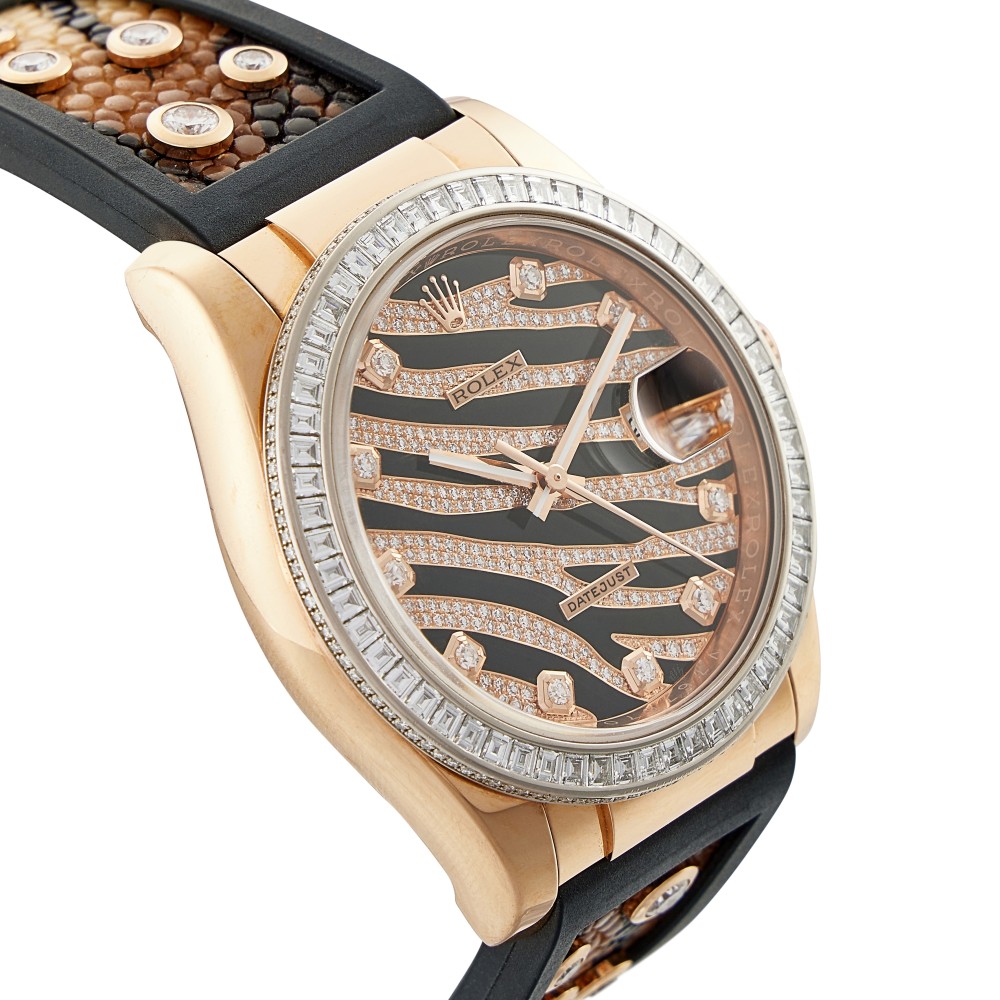 The Rolex Datejust has seen many gem-set variations since its initial launch dating back to 1945 to commemorate the 40th anniversary of Rolex. The Datejust was the world?s first serially produced self-winding wristwatch to feature a date window that would advance automatically past midnight. This Datejust reference 116185BBR is fitted with a baguette and brilliant diamond-set bezel with a pave diamond-set dial with glossy black lacquer accents that mimic the hide of an exotic Zebra. Furthermore, the original Rolex rubber and sting-ray strap with diamonds exceedingly adds an elevated level of lavishness on this watch.18K rose gold and diamond-set case. Automatic movement Calibre 3135 with 31 jewels, case size in 36 mm diameter. 18K rose gold Rolex Oyster fold clasp. This watch comes with paper and box.