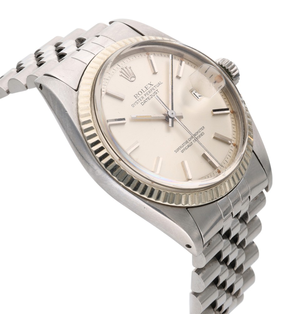 Making its debut in the 1960s with production growing in the 1970s, the 1601 model is paired with a fluted bezel in white gold. Usually Datejust cases are constructed from stainless steel, and precious metals are reserved for the elevated collections such as the “Day-Date.” During this time, Rolex defaulted to using 14k as their precious metal of choice to comply with import restrictions into the U.S.