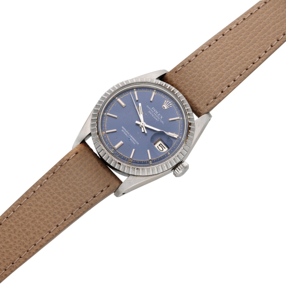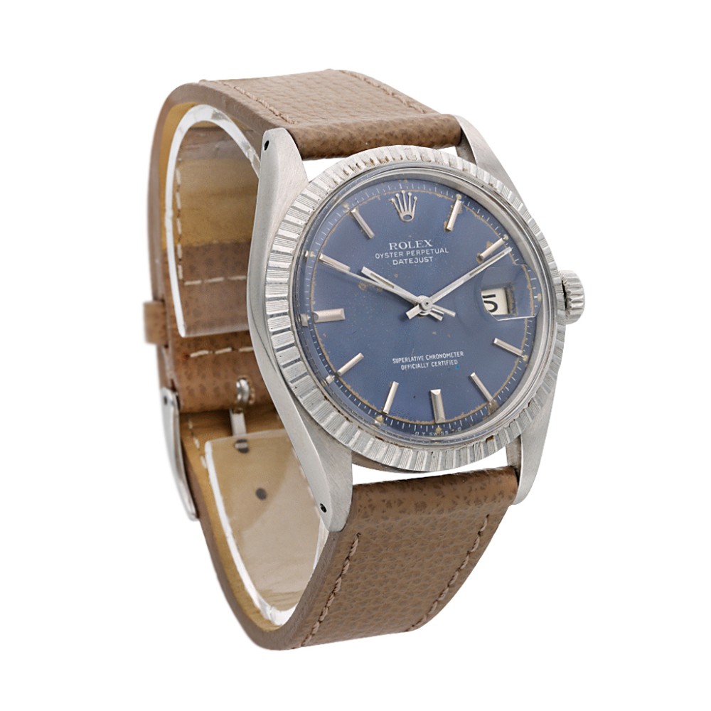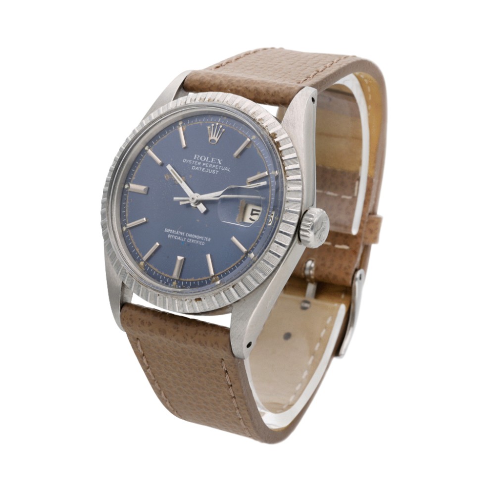 Rolex Datejust ref. 1603 goes back approximately to 1966, featuring a 36mm Oyster case, non-luminous blue sunburst dial and a machine-turned steel bezel.