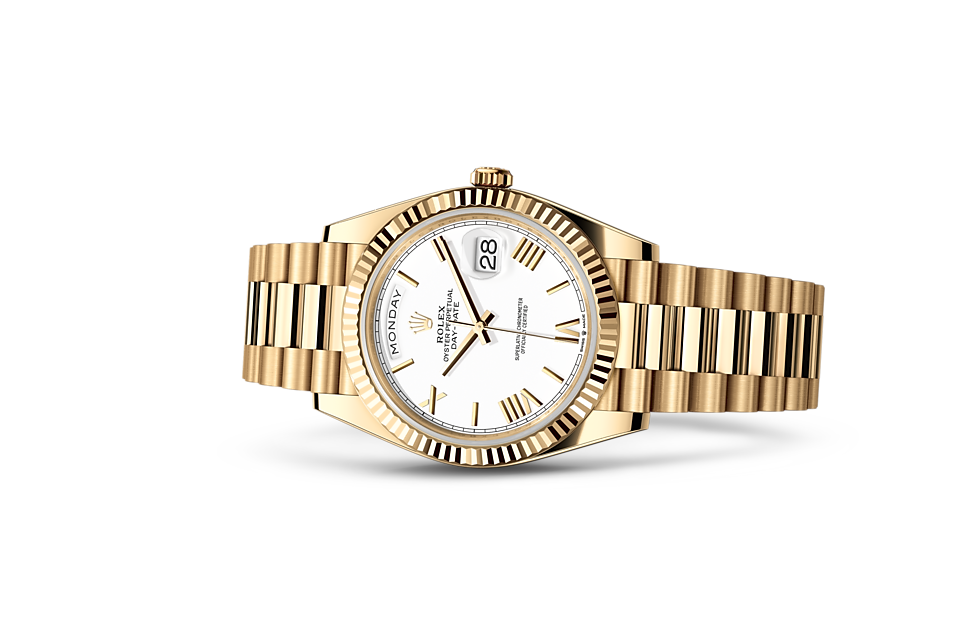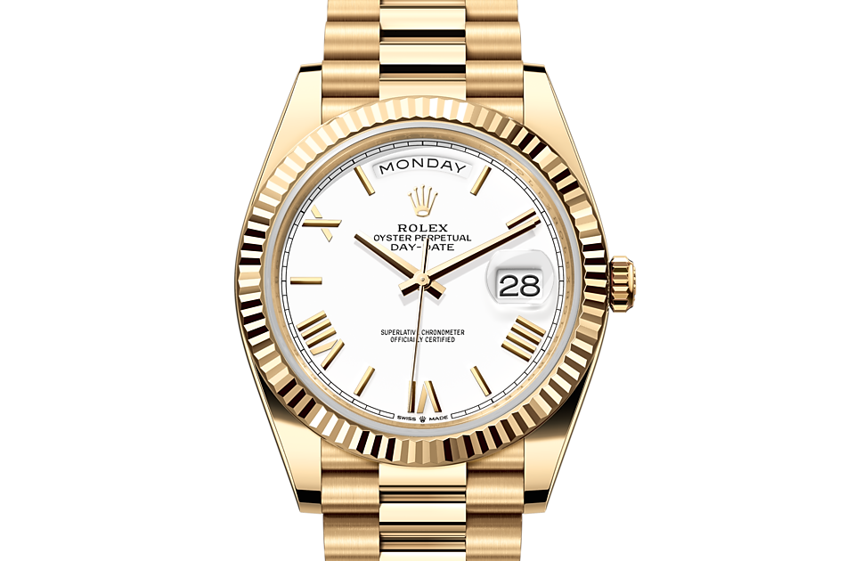 The Rolex fluted bezel is a mark of distinction. Originally, the fluting of the Oyster bezel had a functional purpose: it served to screw the bezel onto the case helping to ensure the waterproofness of the watch. It was therefore identical to the fluting on the case back, which was also screwed onto the case for waterproofness, using specific Rolex tools. Over time, the fluting became an aesthetic element, a genuine Rolex signature feature. Today the fluted bezel is a mark of distinction, in gold on this Day-Date 40.