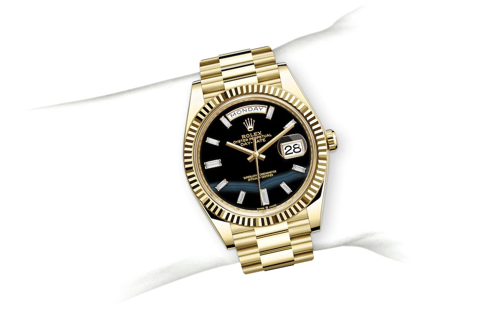 The Rolex fluted bezel is a mark of distinction. Originally, the fluting of the Oyster bezel had a functional purpose: it served to screw the bezel onto the case helping to ensure the waterproofness of the watch. It was therefore identical to the fluting on the case back, which was also screwed onto the case for waterproofness, using specific Rolex tools. Over time, the fluting became an aesthetic element, a genuine Rolex signature feature. Today the fluted bezel is a mark of distinction, in gold on this Day-Date 40.