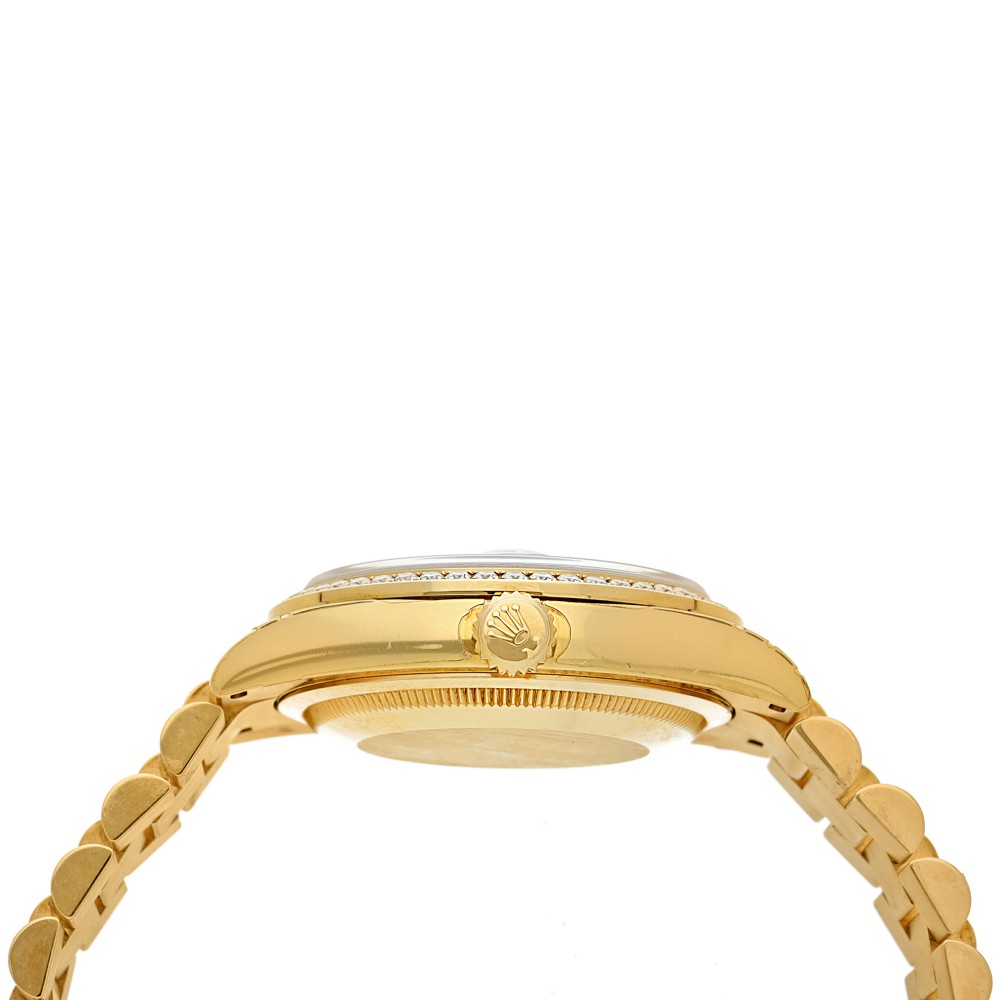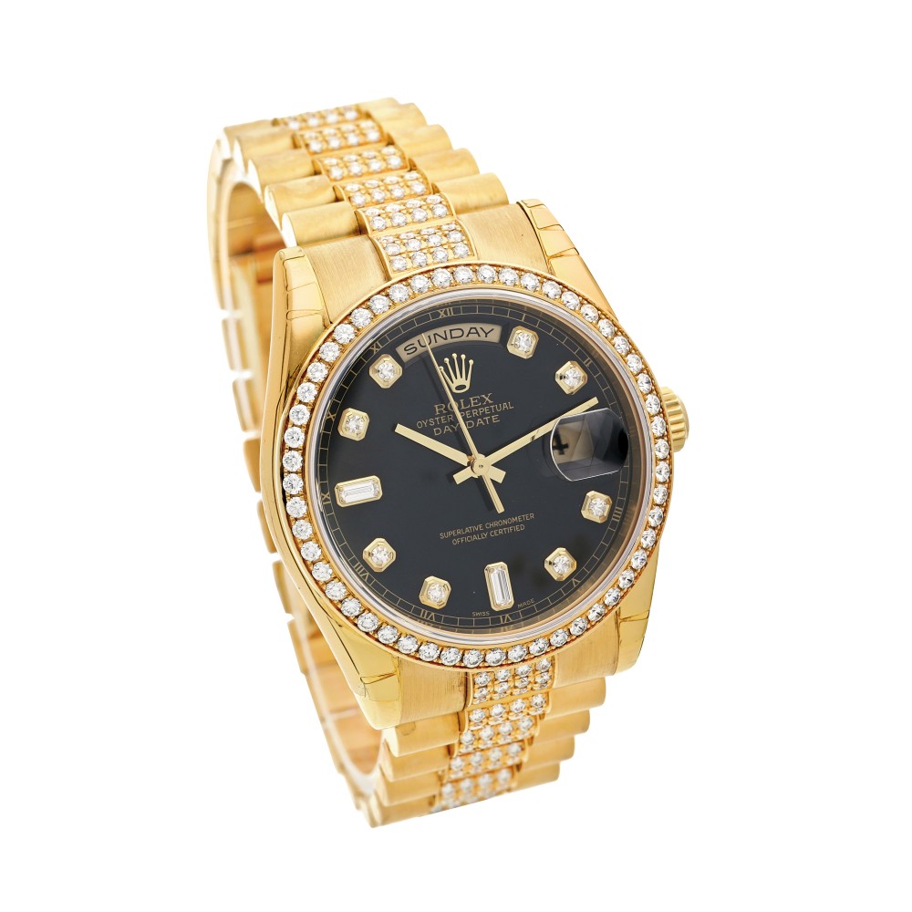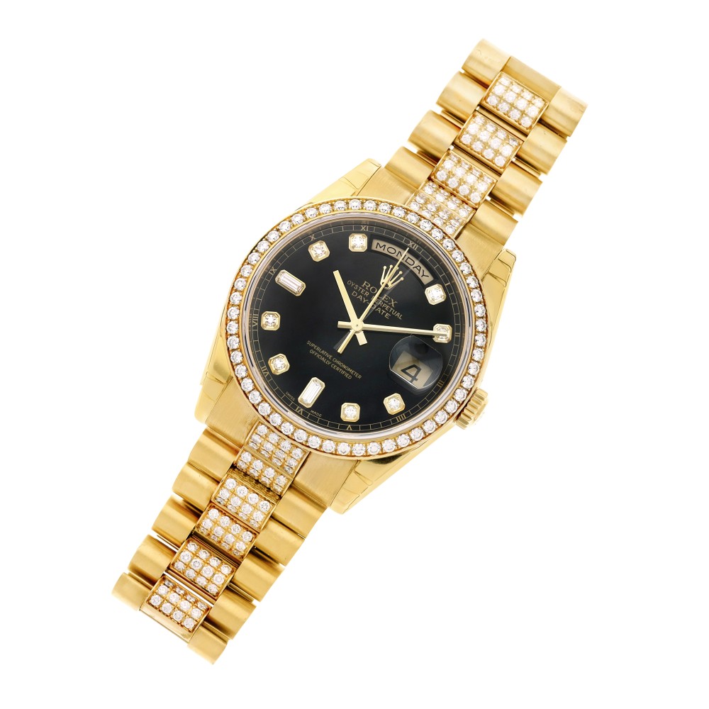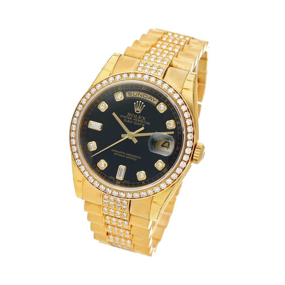 Since 1956, the Day-Date President has been made only in precious metals, making this the perfect luxury watch. The Reference 118348RBR from 2000 features a yellow gold case and bracelet, a black dial, and diamonds decorating the timepiece on the dial, case, and bracelet.