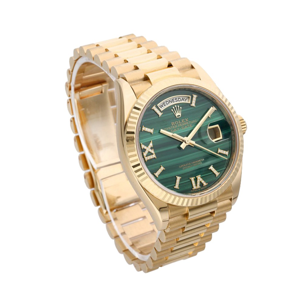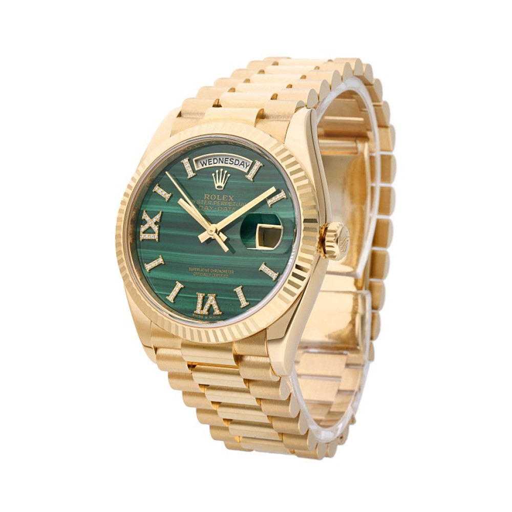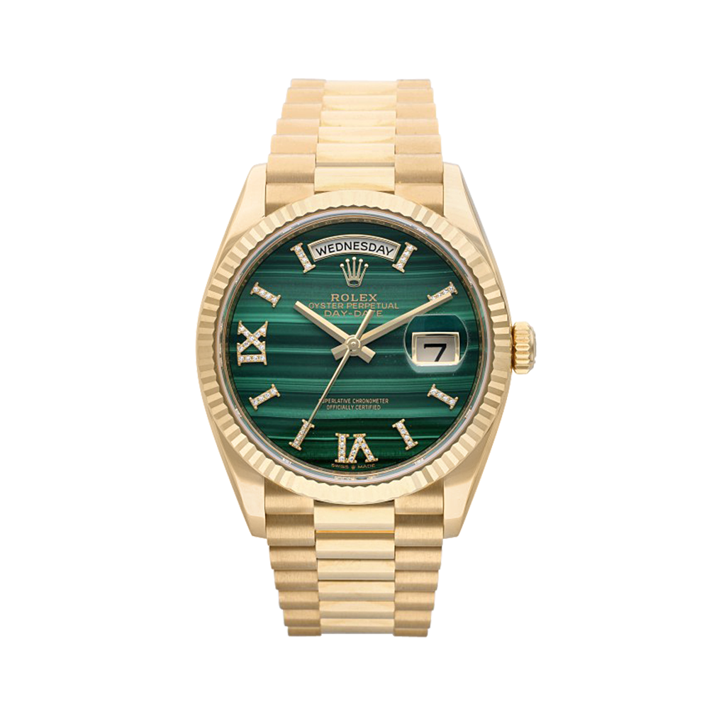 This Rolex Day-Date Reference 128238 is crafted entirely from 18k yellow gold. It features a lustrous green malachite dial with diamond-set Roman numeral hour markers, day and date complications, a fluted bezel, and is fitted to the Day-Date’s exclusive President bracelet. Accompanied by its original box and papers, the present timepiece is a rare find for any collector.