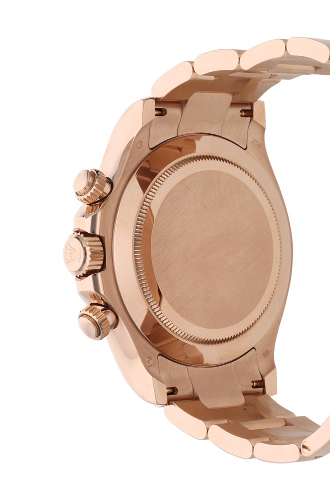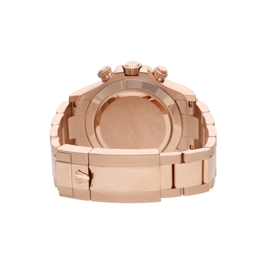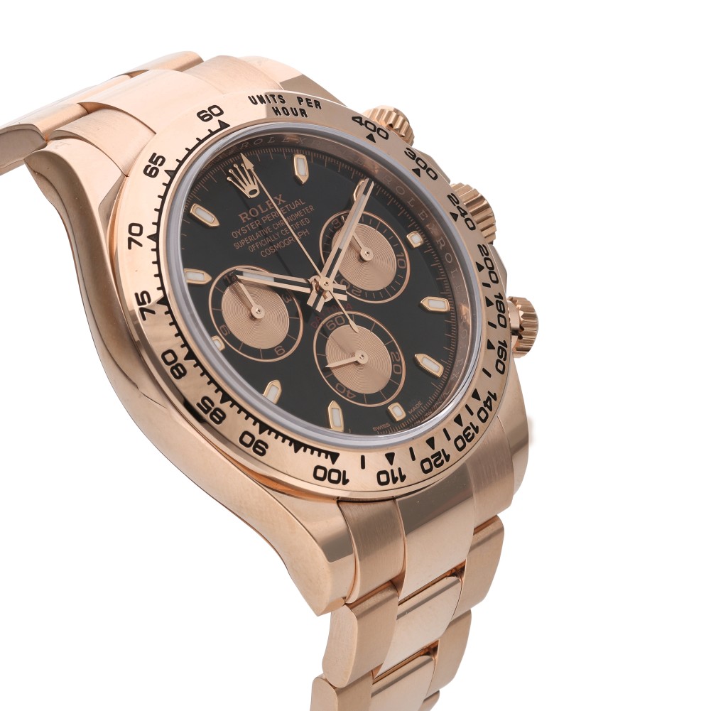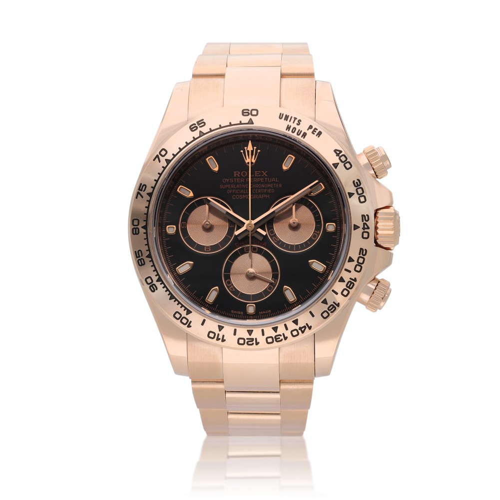 Ranking among the most iconic chronographs, the Daytona family has adopted different styles and variations since launching in the 1960s. The present example, produced circa 2012, stands as an example of Rolex?s more experimental approach to material and design of the classic Daytona, featuring an 18kt pink gold case and bracelet in contrasting finishes and a black dial with subsidiary dials in pink gold.