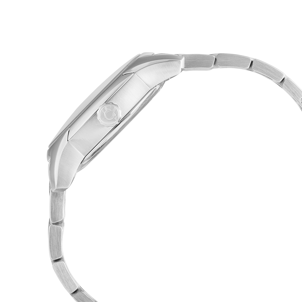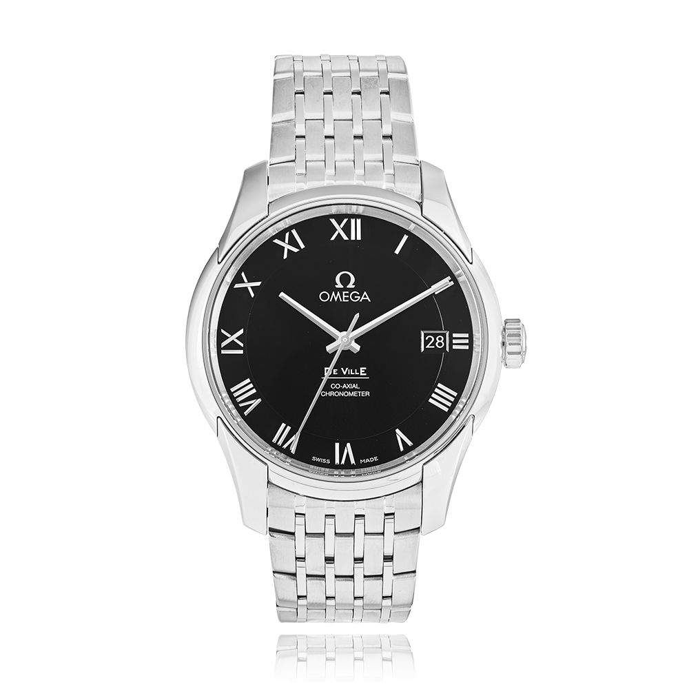 Omega De Ville with a 41 mm stainless steel case and a sapphire glass, water-resistant; inside is the automatic caliber 8500, a black Roman face with date indication, the bracelet is a steel metal bracelet; accessory: Bucherer box.